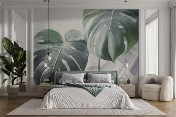 Fototapetes Teksturētas monstera lapas, lielas un zaļas, uz mīksta, gaiša abstrakta fona Nr. w09477