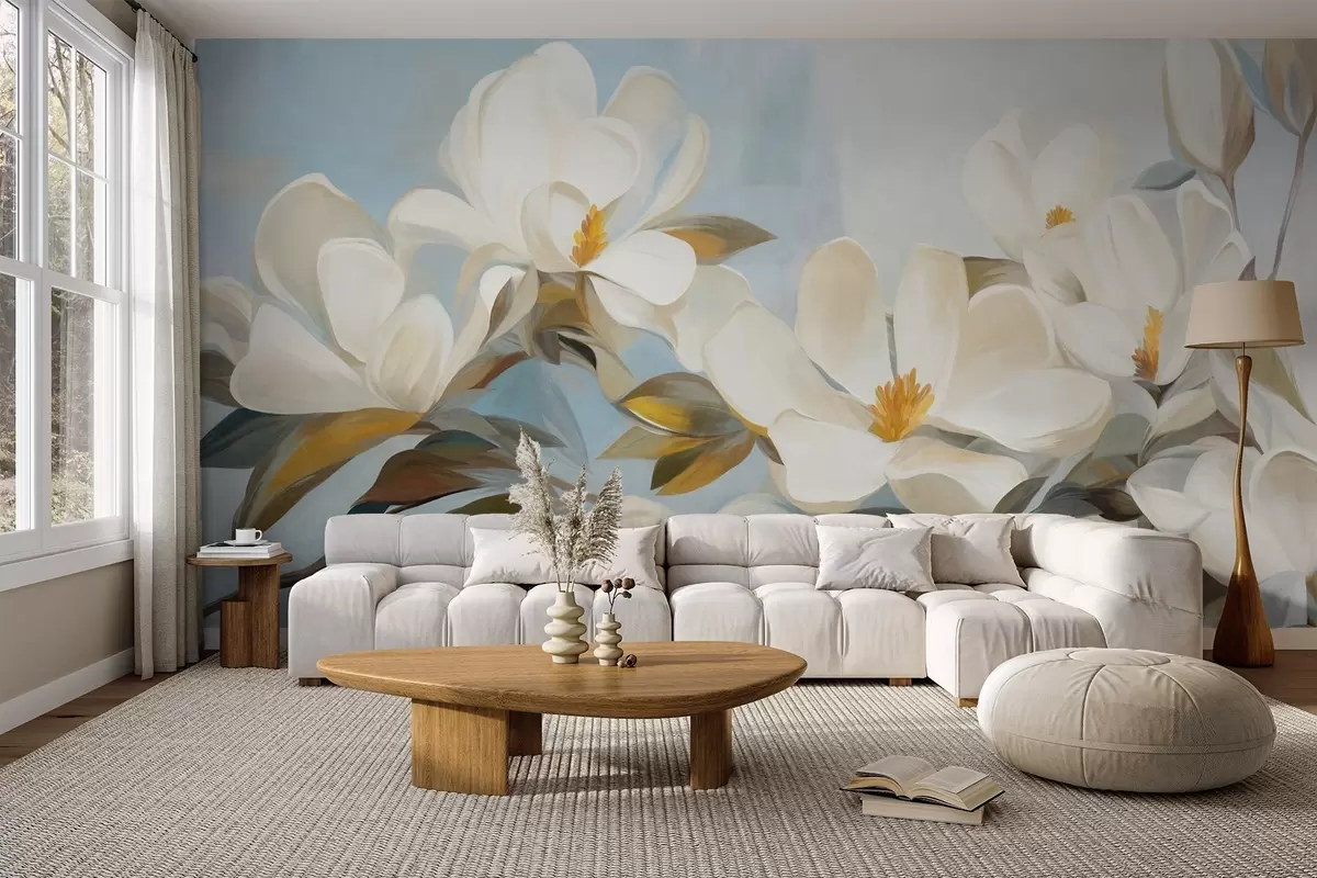 Fototapetes Baltas magnolijas ar zaļām lapām uz gaiši zila fona ar abstraktu otu triepienu imitāciju Nr. w09478