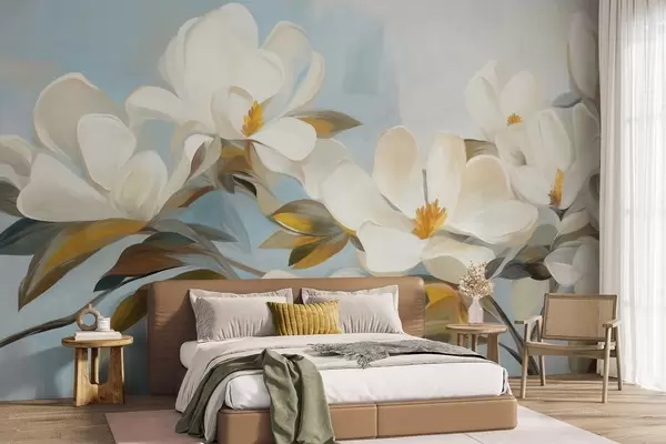 Fototapetes Baltas magnolijas ar zaļām lapām uz gaiši zila fona ar abstraktu otu triepienu imitāciju Nr. w09478