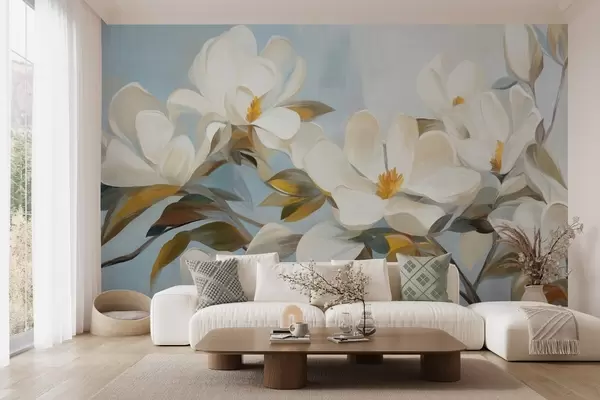Fototapetes Baltas magnolijas ar zaļām lapām uz gaiši zila fona ar abstraktu otu triepienu imitāciju Nr. w09478