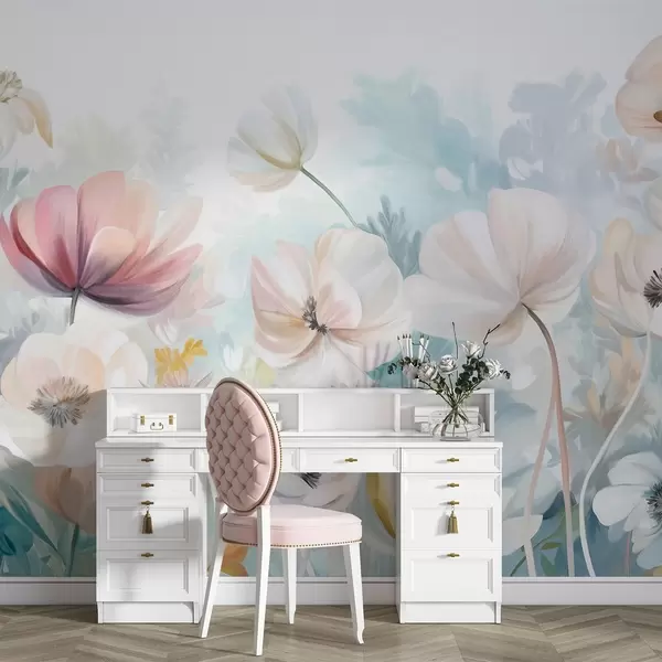 Fototapetes Pastelkrāsainu ziedu lauks ar maigiem ziedlapiem, maigi zaļām lapām, sapņainā, faktūriņā akvareļu stilā Nr. w09481