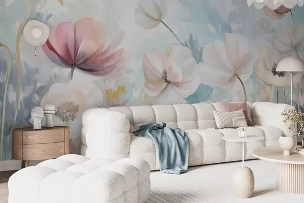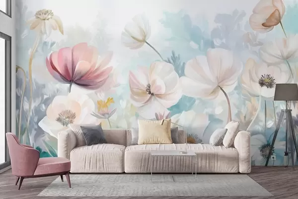 Fototapetes Pastelkrāsainu ziedu lauks ar maigiem ziedlapiem, maigi zaļām lapām, sapņainā, faktūriņā akvareļu stilā Nr. w09481