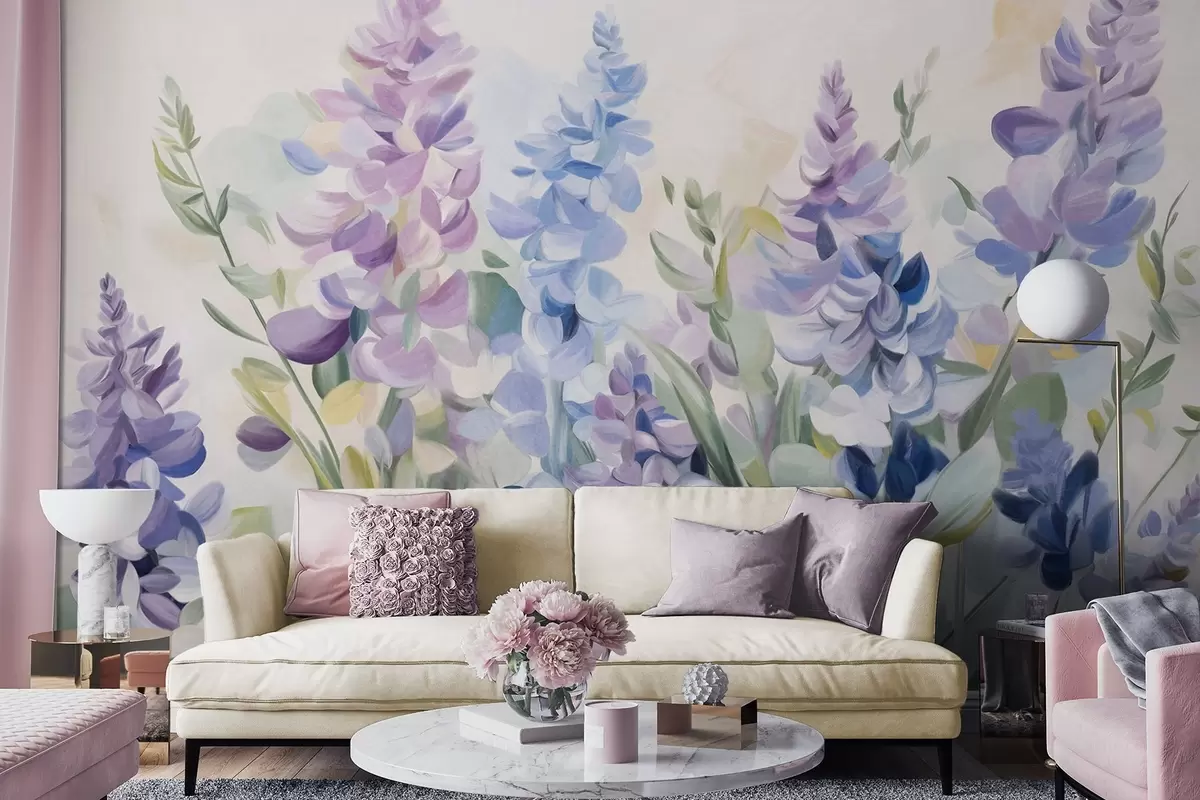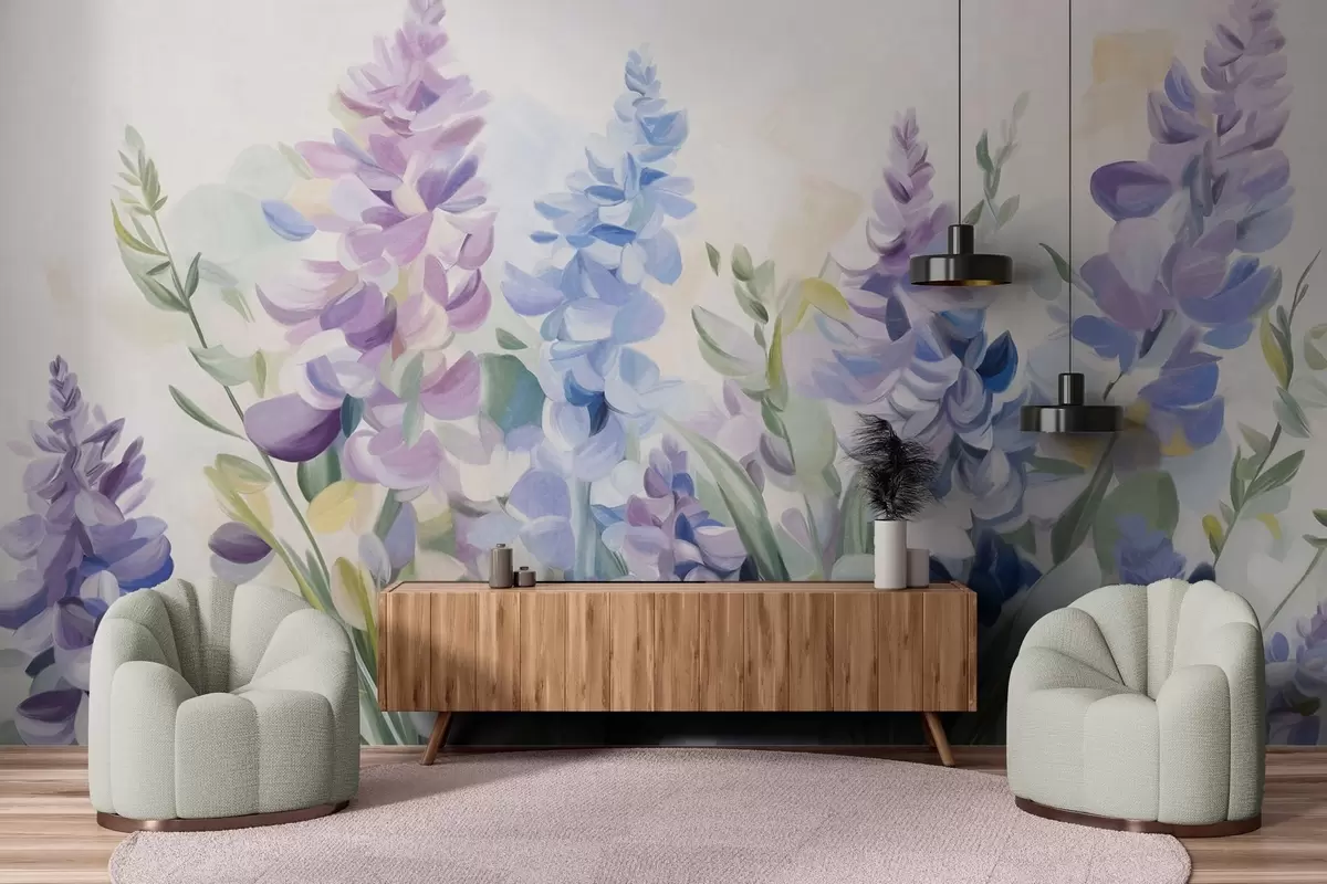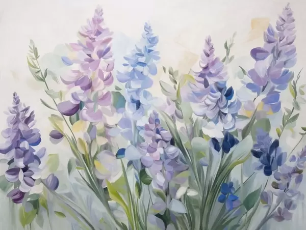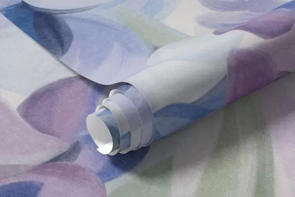 Fototapetes Violeti un zili teksturēti ziedi ar zilām lapām, gaišs fons, maigi otu triepieni, košas krāsas Nr. w09482