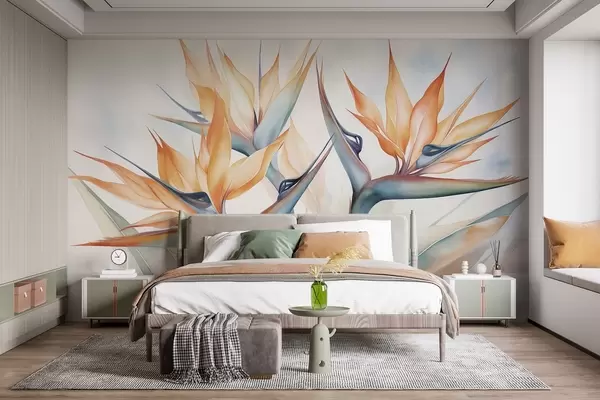 Fototapetes Paradīzes putna zieds, strelitcija ar oranžiem ziedlapiņām, maigs akvareļa tekstūras stils, gaišs fons Nr. w09483