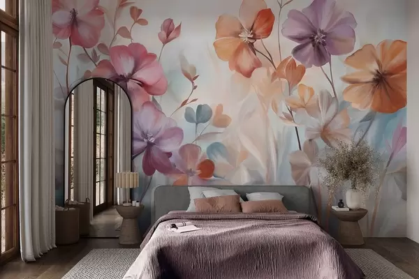 Fototapetes Teksturēts ziedu kompozīcija ar rozā, violeti un oranžiem ziediem ar zaļiem stublājiem un lapām, maigās pasteļtoņos Nr. w09486