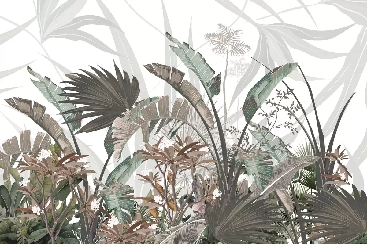 Fototapetes Tropu teksturētas lapas ar ziediem, palmas, plumerijas ziedi, pasteļtoņi, balts fons, džungļi Nr. w09488