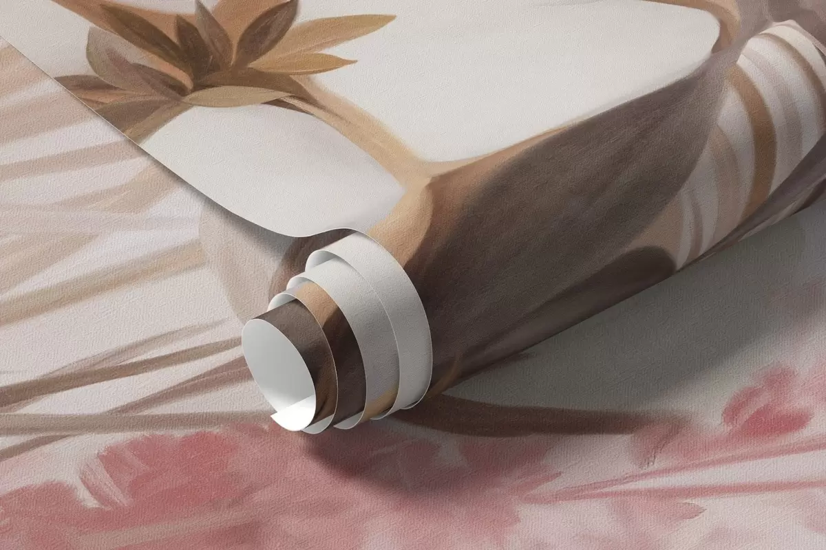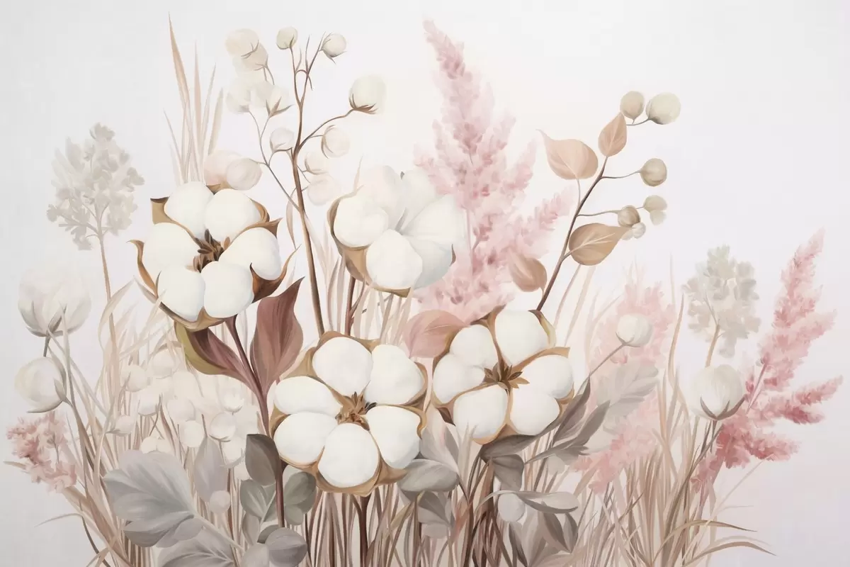 Fototapetes Kokvilnas tekstūras ziedi ar baltiem un rozā pampas zāles stiebriem, smilškrāsas un brūnas lapas un garšaugi, balts fons Nr. w09489