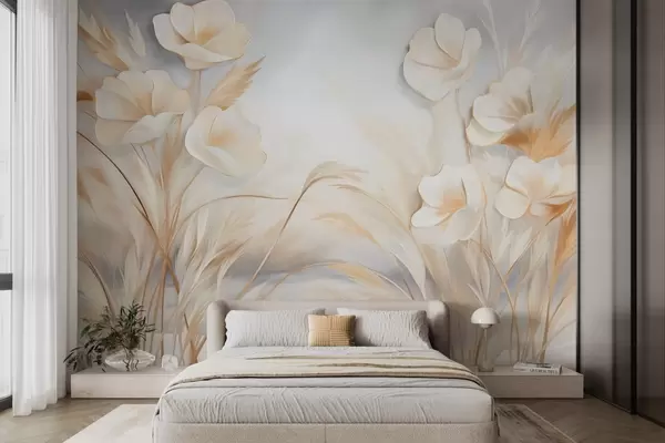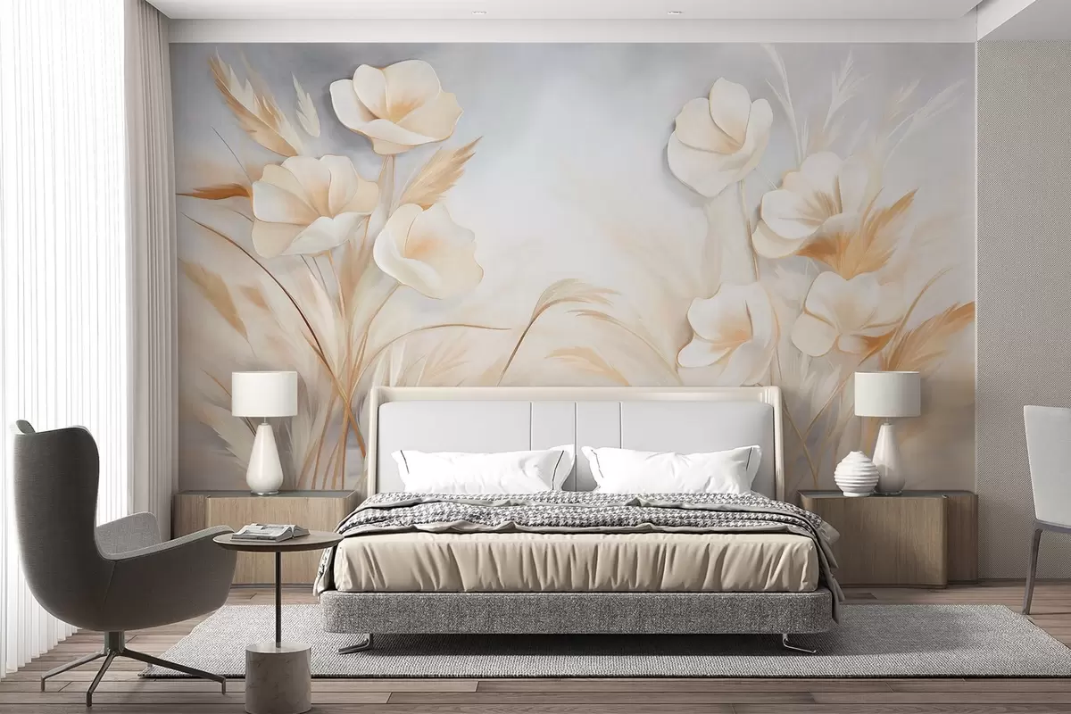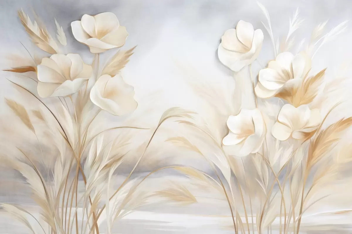 Fototapetes Baltas puķes, smilškrāsas niedres un pampas zāle, faktūru, elegants, minimālisma stils, ainavas abstrakts fons Nr. w09490