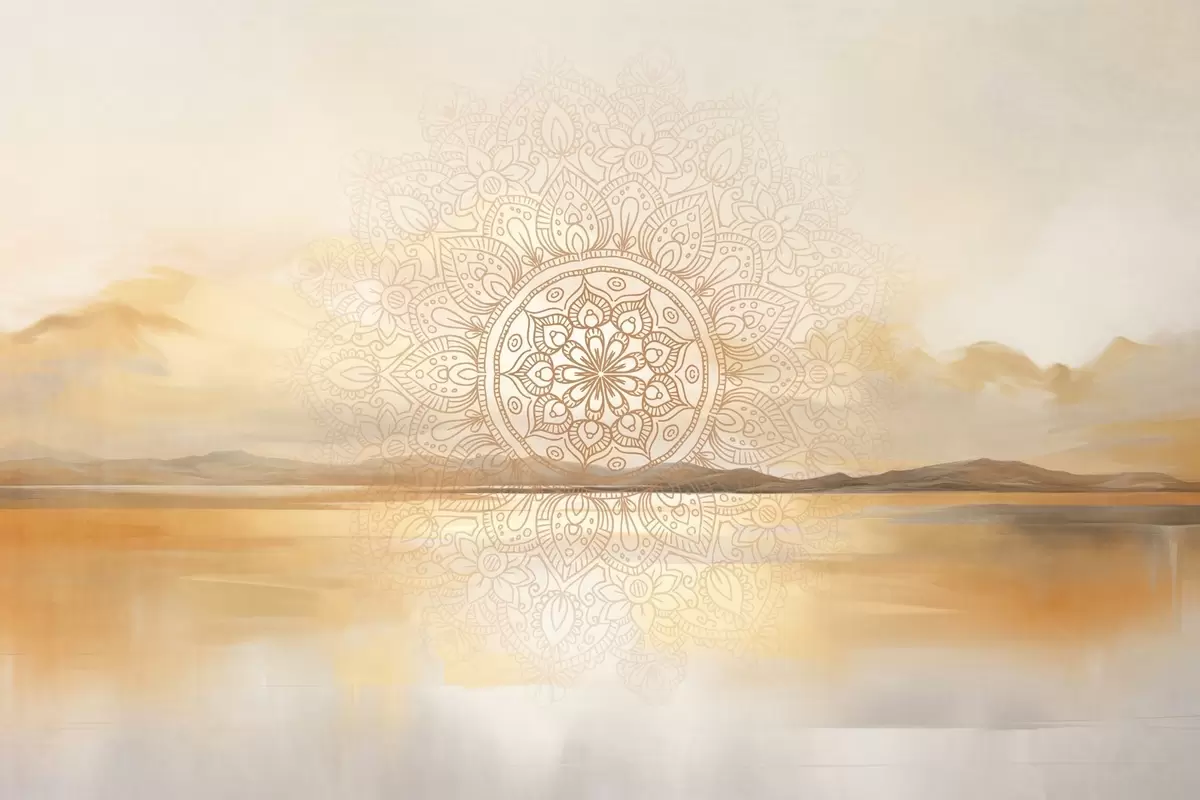 Fototapetes Teksturēts simetriskas mandalas dizains, kas pārklāj ainavu ar jūru, kalniem un debesīm, maigas pasteļtoņos krāsas Nr. w09491
