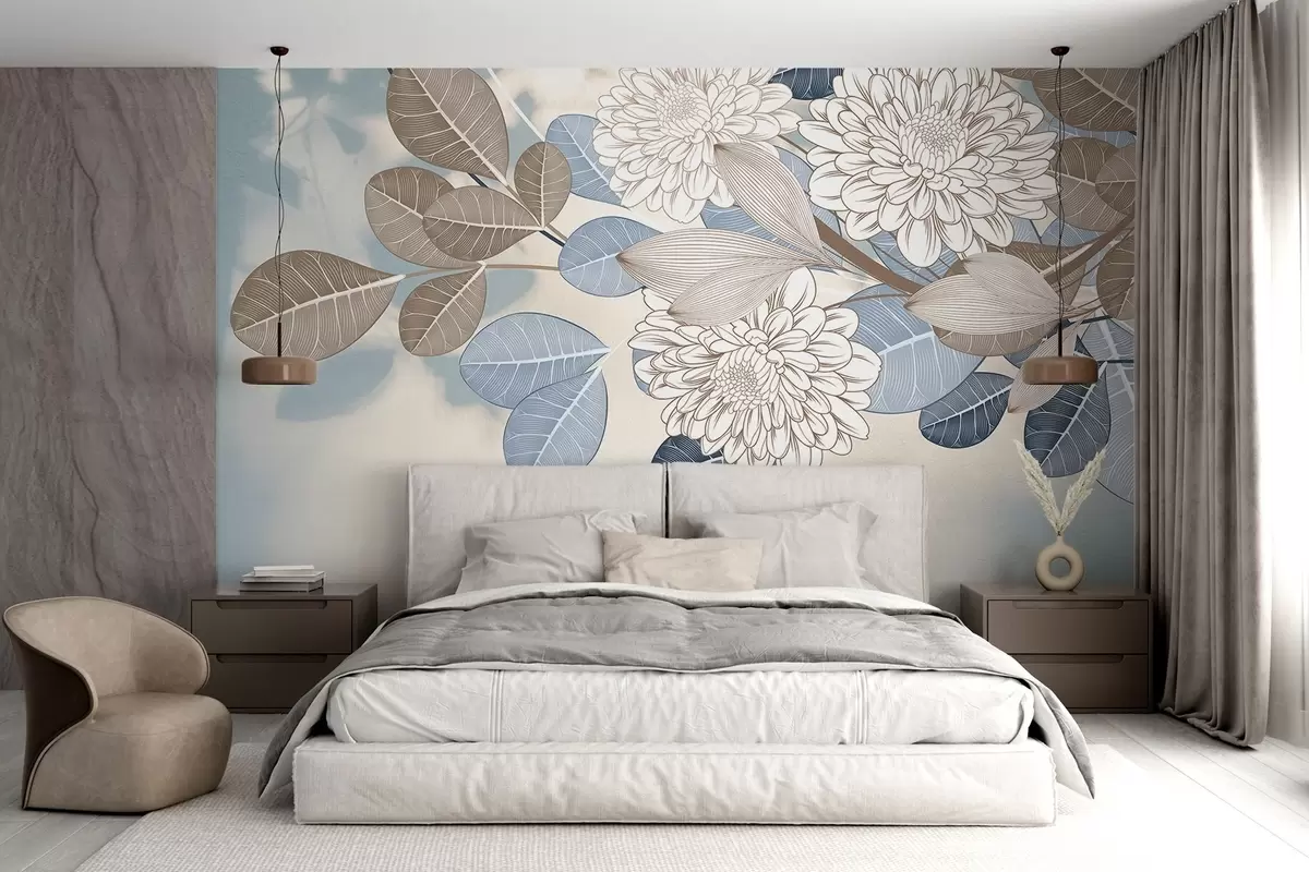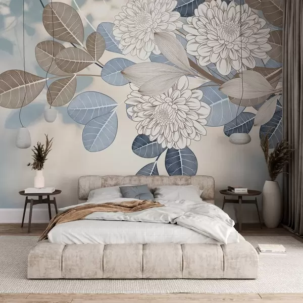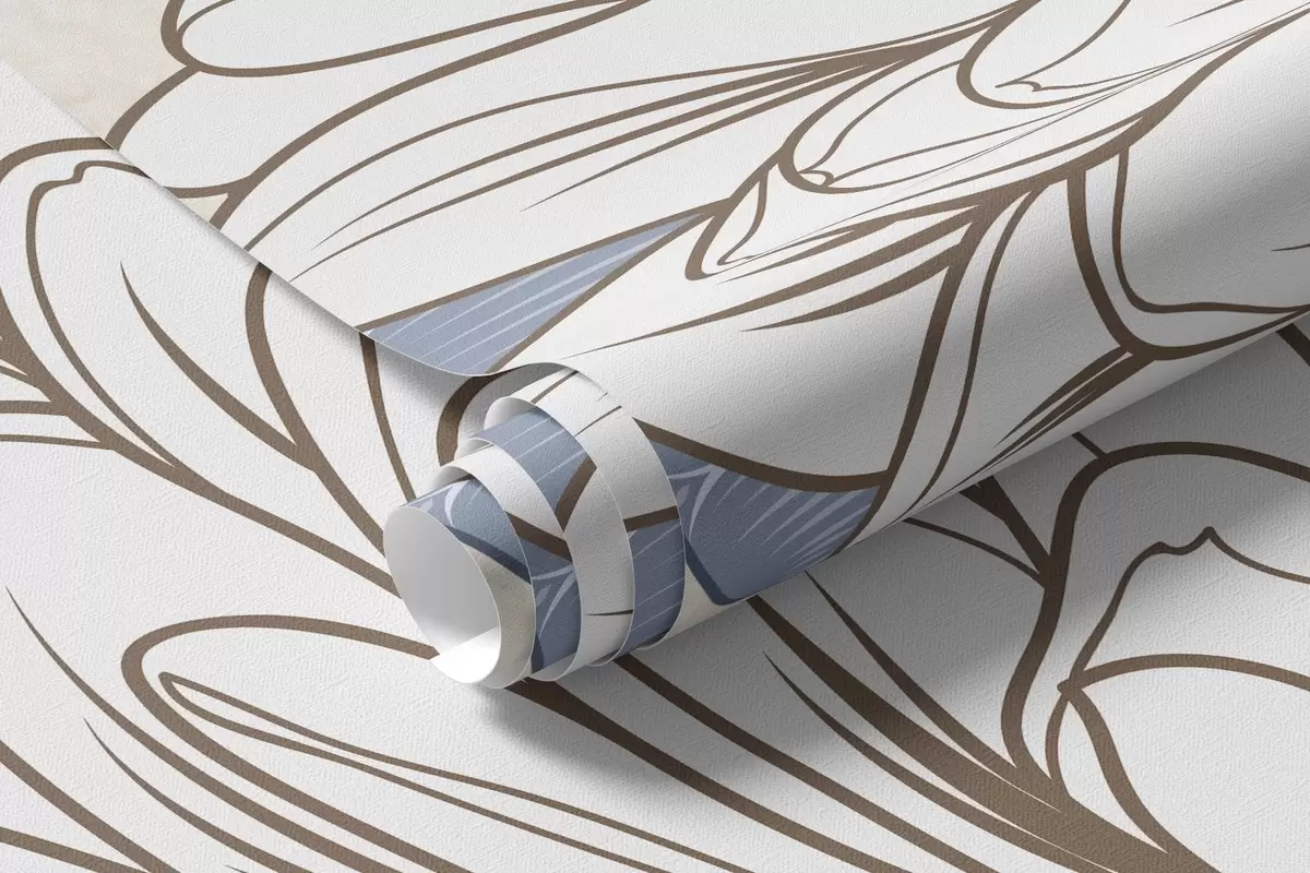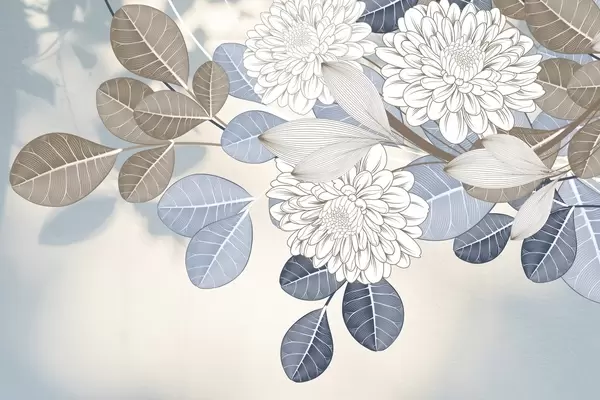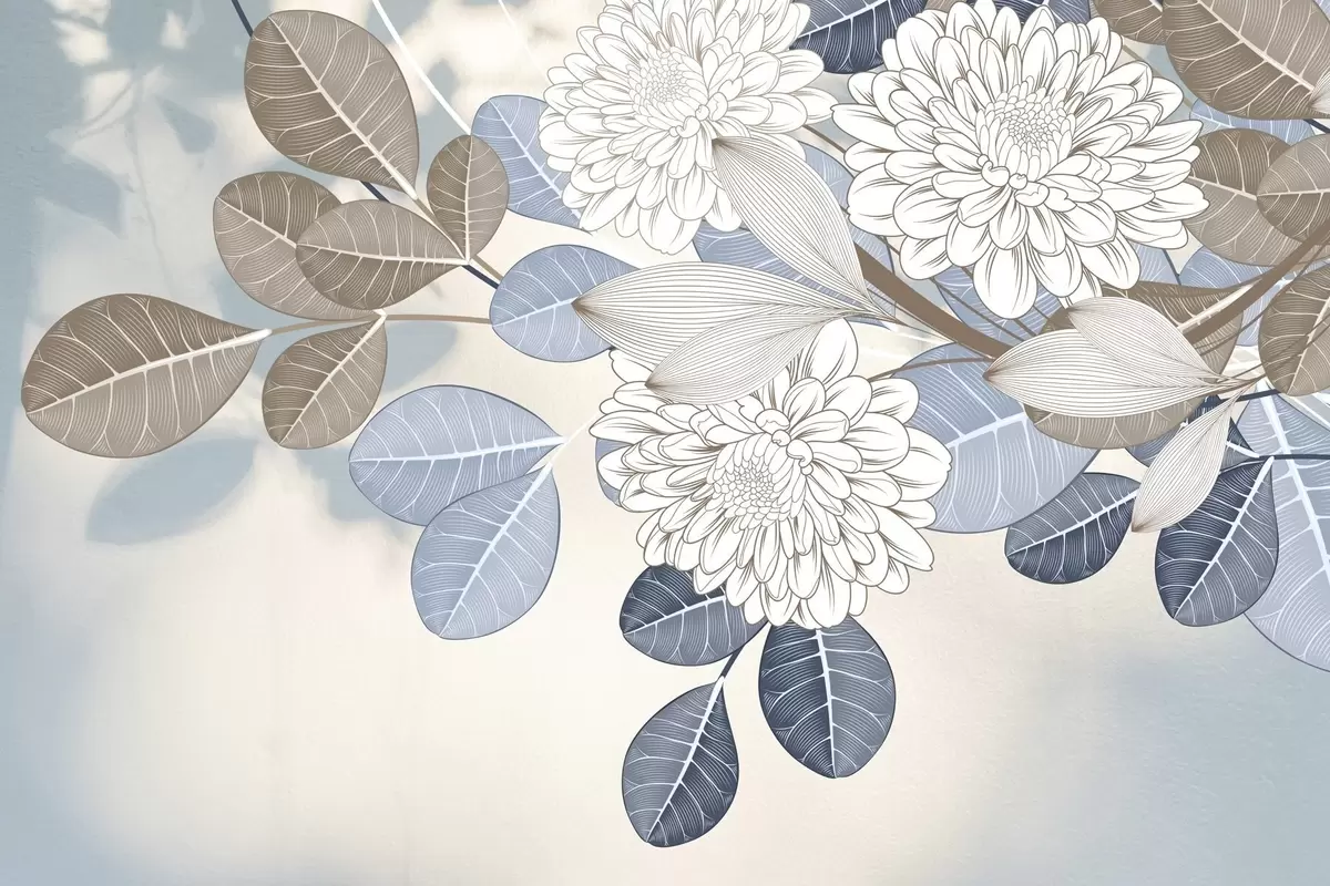 Fototapetes Baltas puķes ar zilām un brūnām lapām, gaiši zils teksturēts fons, ziedu kompozīcija, detalizēta līniju grafika Nr. w09496