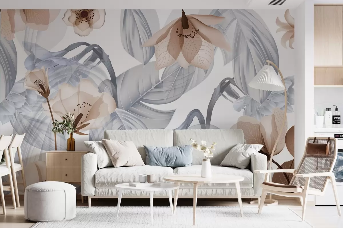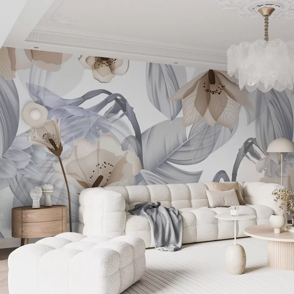 Fototapetes Brūni ziedi un pelēkas lapas, ziedu botāniskais fons, elegants dizains, maigas krāsas, gaišas, delikātas detaļas Nr. w09497v1