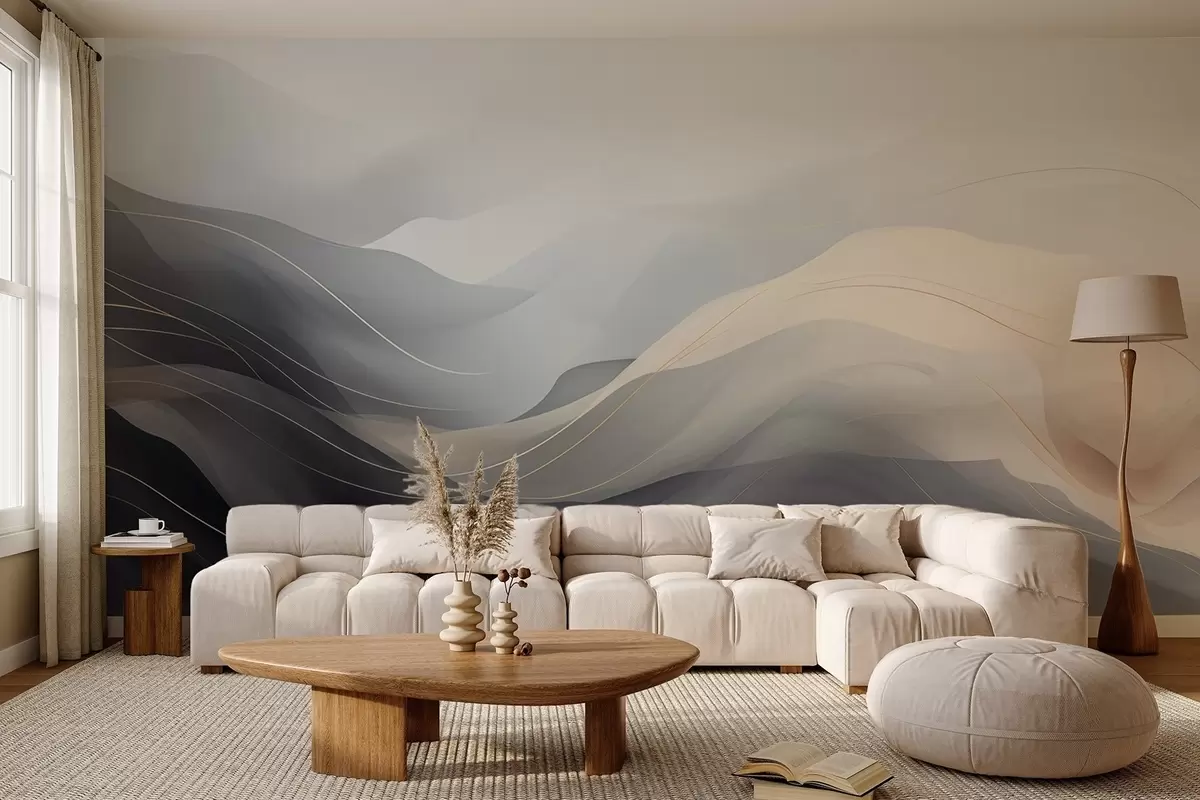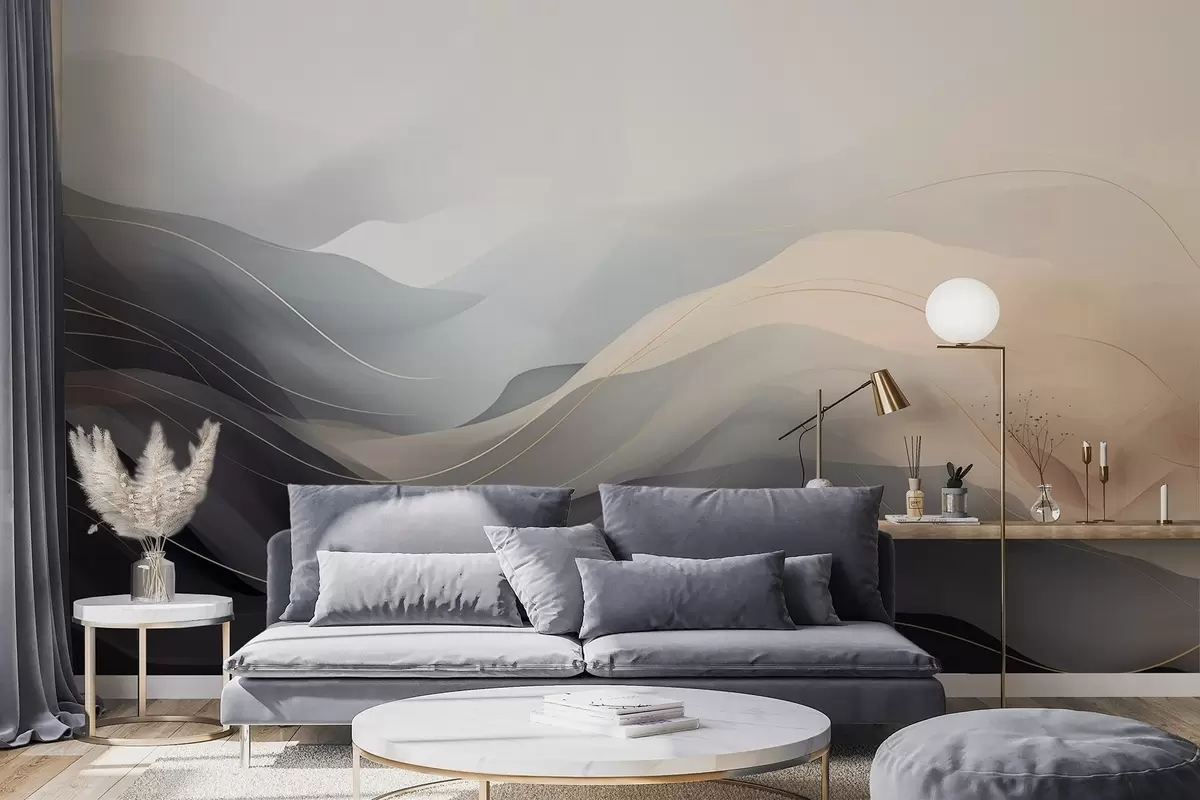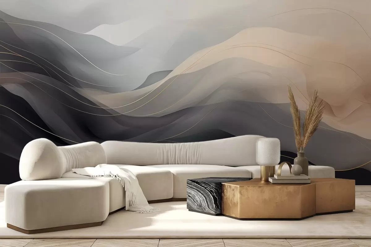 Fototapetes Abstraktas miglas viļņi pelēkā krēmkrāsā ar dzeltenām līnijām w09504
