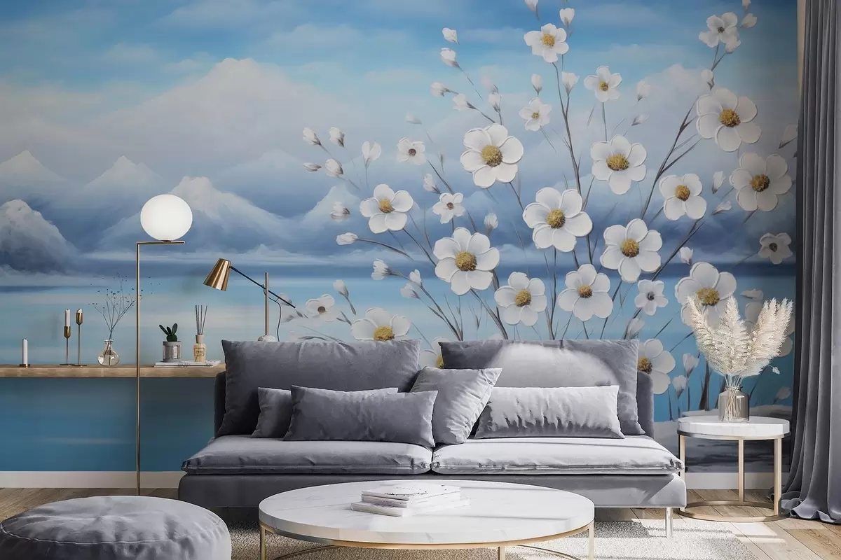 Fototapetes Baltas pavasara puķes pie ledaina ezera ar sniegotām kalnām eļļas krāsu stilā Nr. w09526