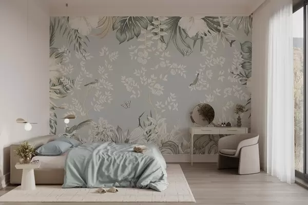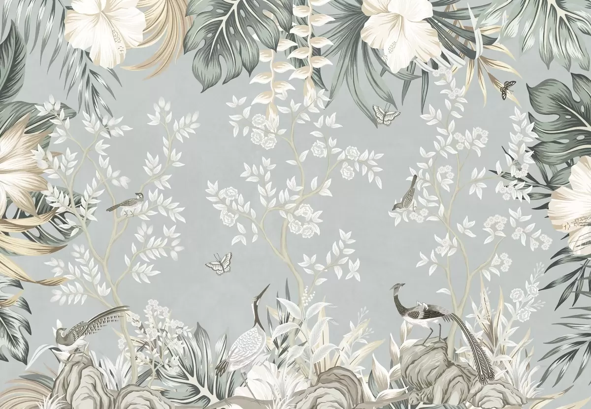 Fototapetes Tropu tekstūras pasteļtoņos mākslas darbs ar putniem, tauriņiem, hibisku ziediem, palmu lapām un kokiem gaiši zilā fonā Nr. w09528