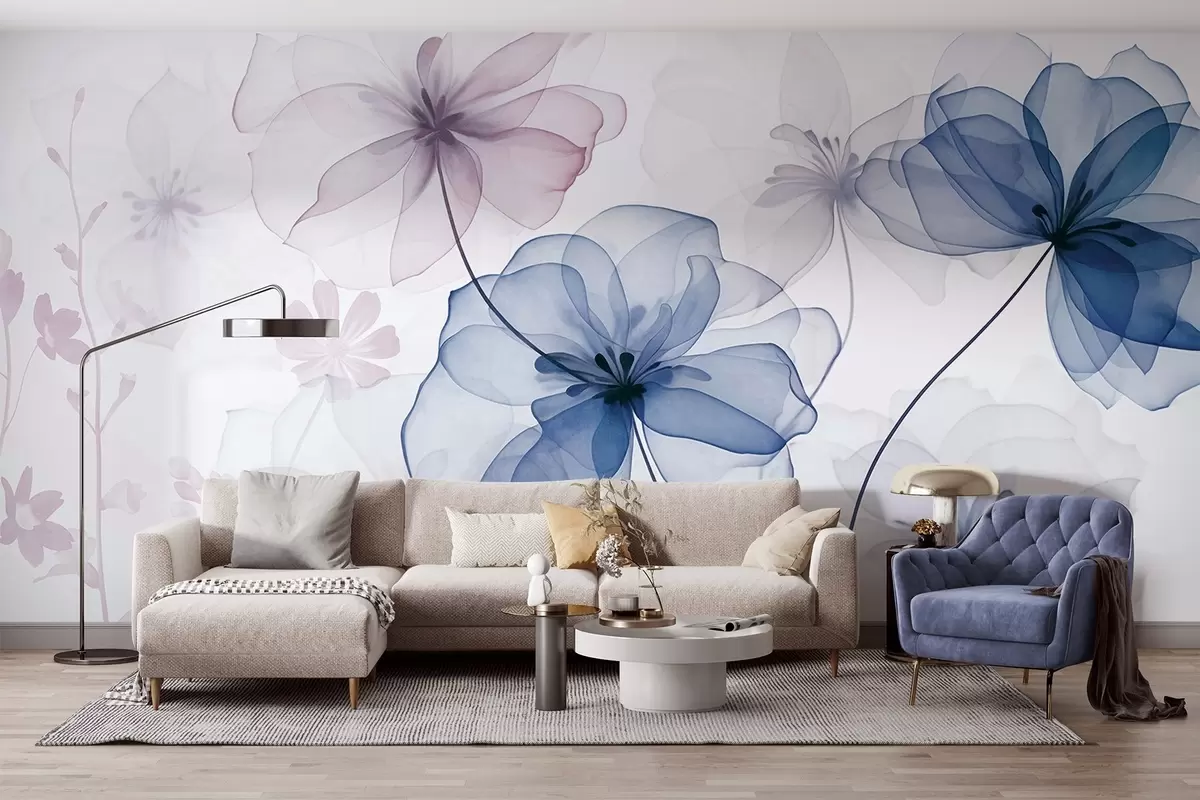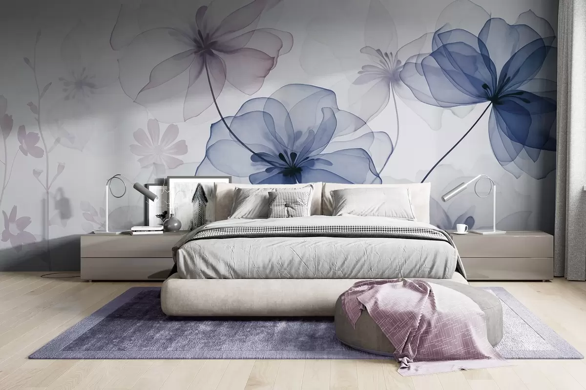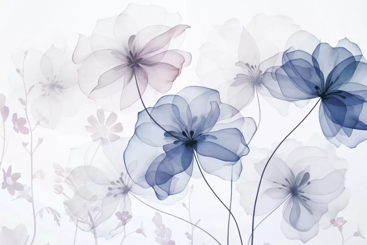 Fototapetes Caurspīdīgi ziedi ar klusināti ziliem un rozā ziedlapām, gariem kātiem, gaišu fonu, maigām krāsām un teksturētu ziedu dizainu Nr. w09529v1