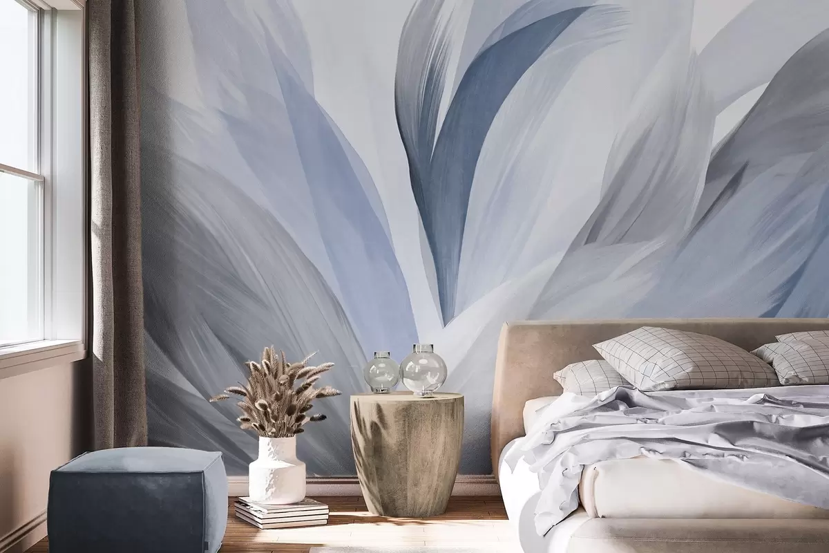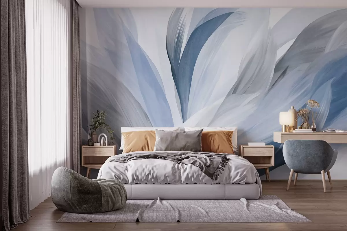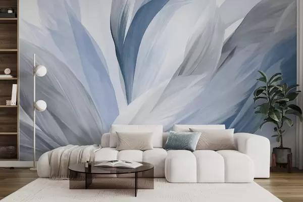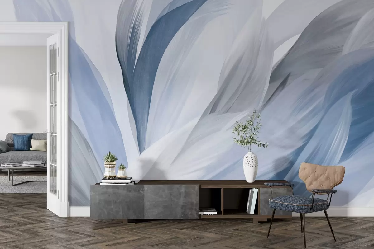 Fototapetes Abstraktas teksturētas spalvas zilā, baltā un pelēkā krāsā un dažādos toņos, pārklājas uz balta fona Nr. w09531v1