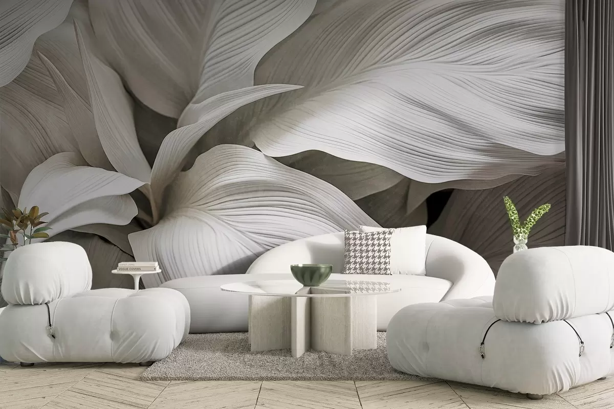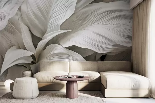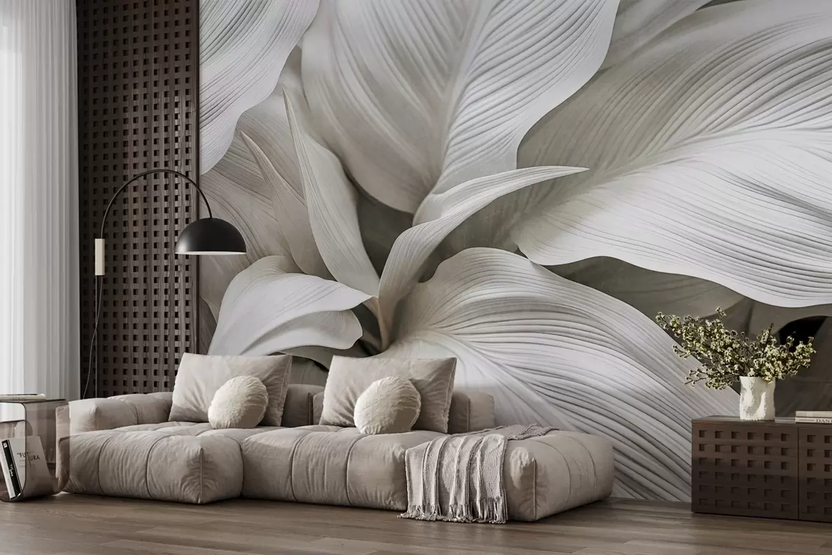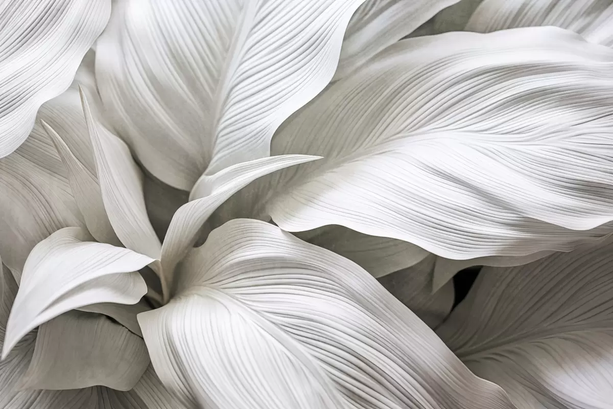 Fototapetes Lielas, teksturētas baltas lapas ar izteiktām vēnām, kas pārklājas un rada dziļumu Nr. w09536