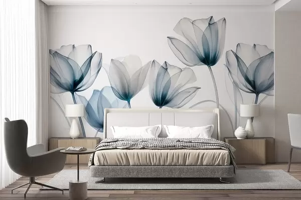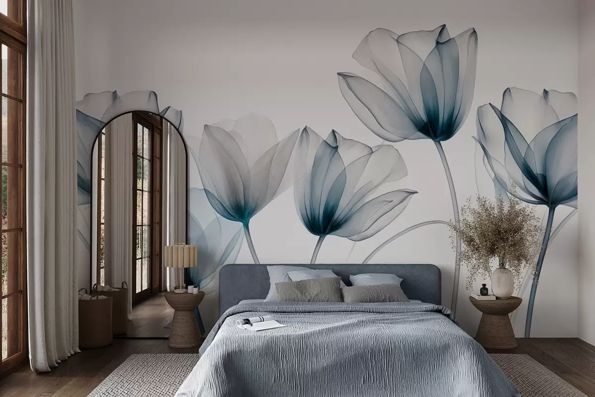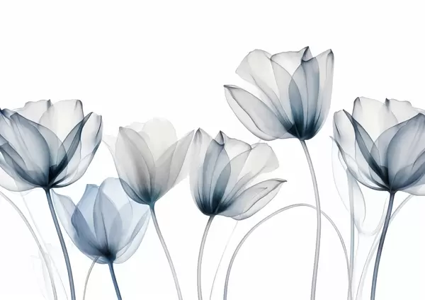 Fototapetes Caurspīdīgi zili un balti tulpju ziedi ar gariem kātiem uz gaiša fona, delikāts un teksturēts ziedu mākslas darbs. Nr. w09538