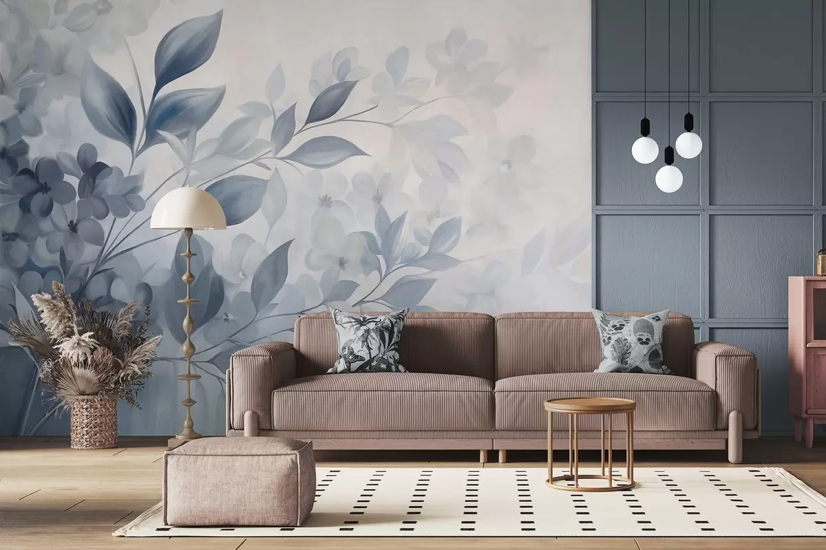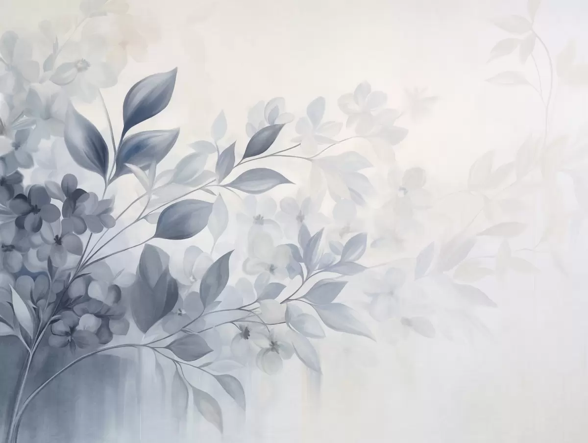 Fototapetes Teksturēta zila un balta zaru ar ziediem un lapām, kas izplūst gaišā fonā akvareļu glezniecības stilā Nr. w09543