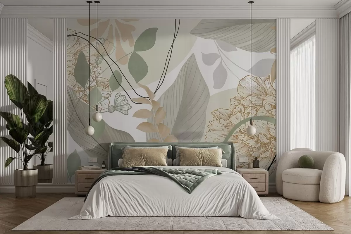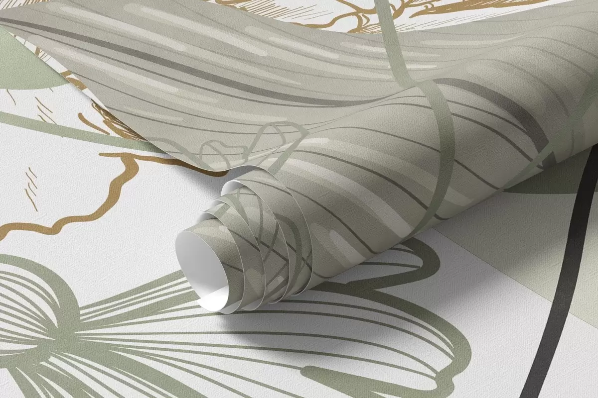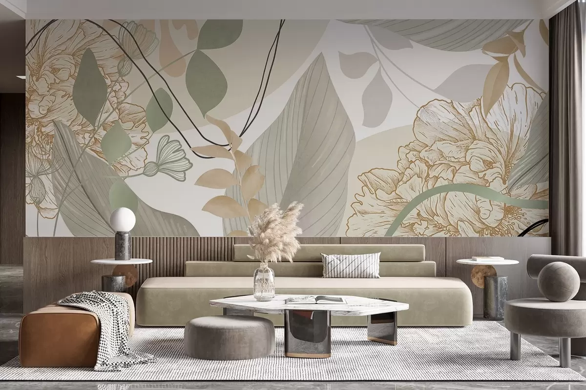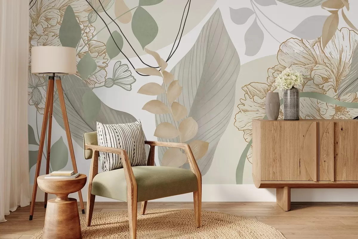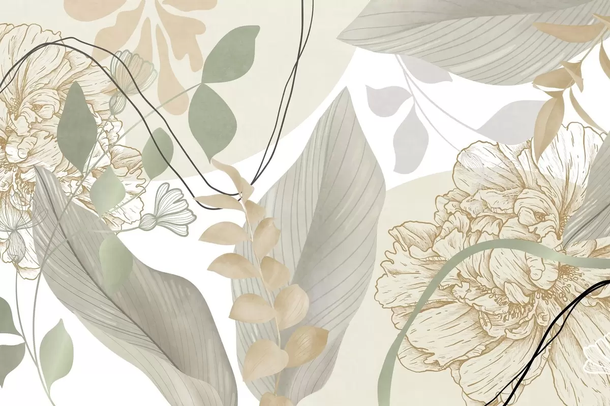 Fototapetes Abstrakts ziedu raksts ar lielām lapām klusināti zaļā un dzeltenā krāsā ar plānām melnām līnijām un baltiem ziedu kontūriem Nr. w09544v2