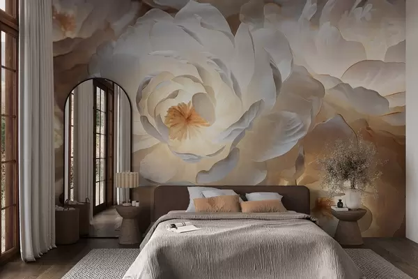 Fototapetes Lieli, balti fantāzijas peoniju ziedi ar dzeltenu centru, maigu apgaismojumu un delikātiem, teksturētiem slāņveida ziedlapām. Nr. w09550