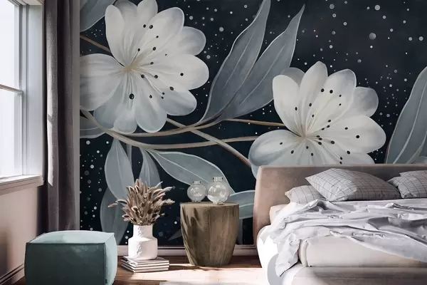 Fototapetes Fantastiski teksturēti balti ziedi, apņemti ar zili zaļām lapām un zariem uz tumša fona Nr. w09551