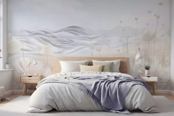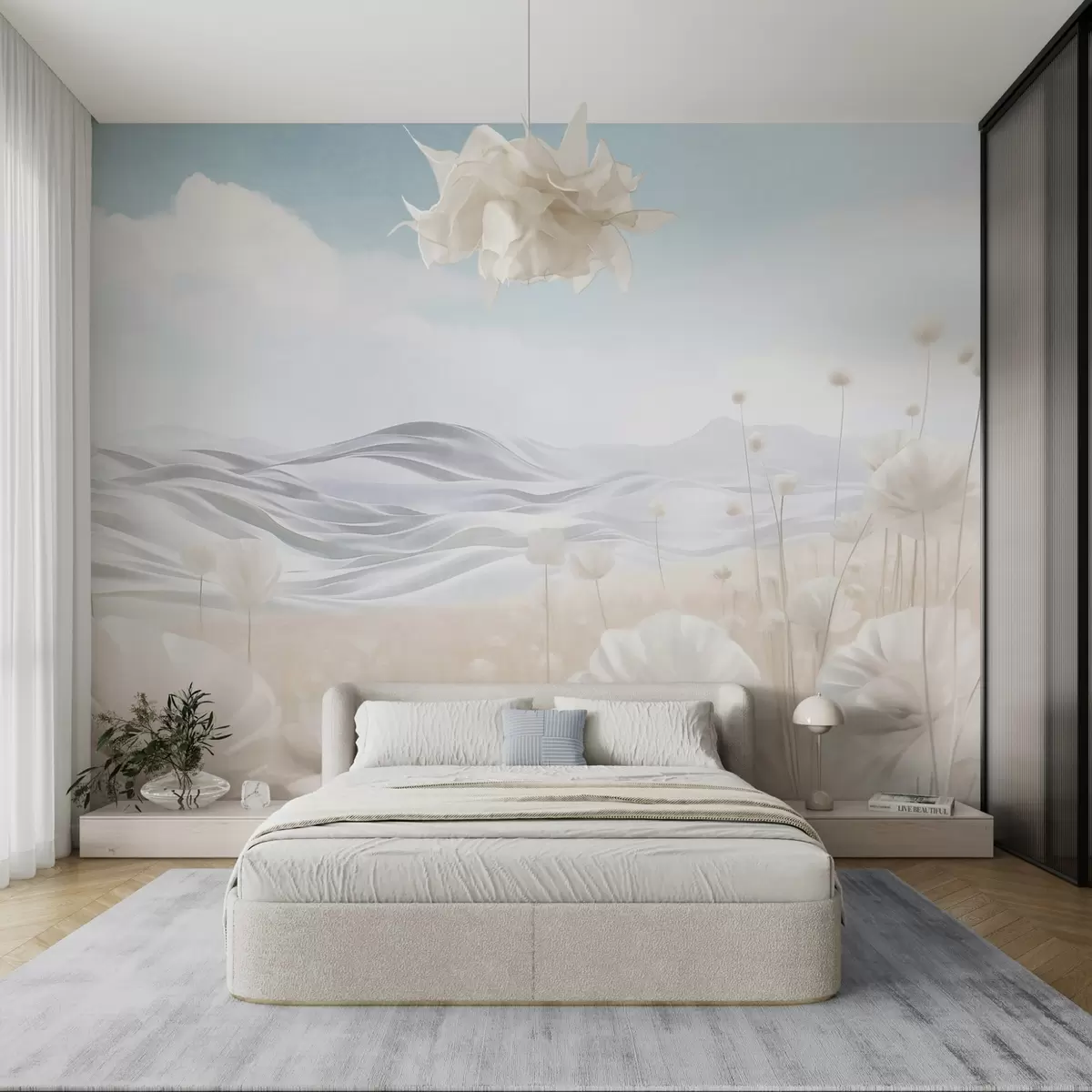 Fototapetes Teksturēts krēmkrāsas magoņu lauks ar līdzenām pakalnu virsotnēm zem gaiši zila debesu velves ar maigiem mākoņiem, pasteļtoņos Nr. w09553