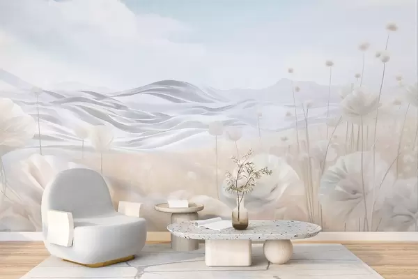 Fototapetes Teksturēts krēmkrāsas magoņu lauks ar līdzenām pakalnu virsotnēm zem gaiši zila debesu velves ar maigiem mākoņiem, pasteļtoņos Nr. w09553