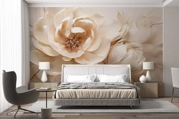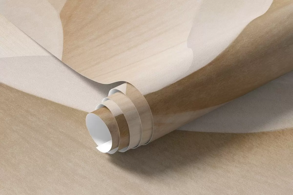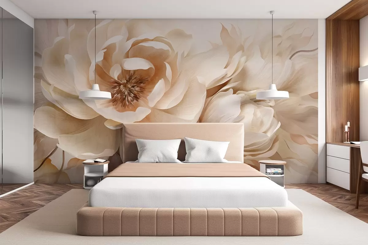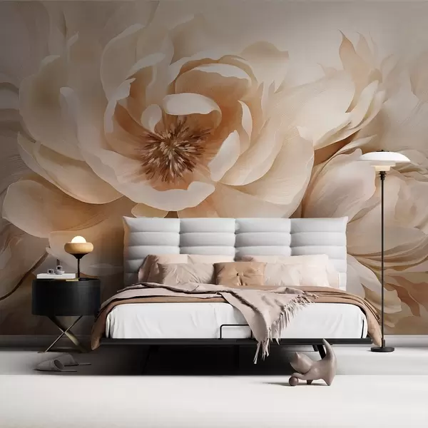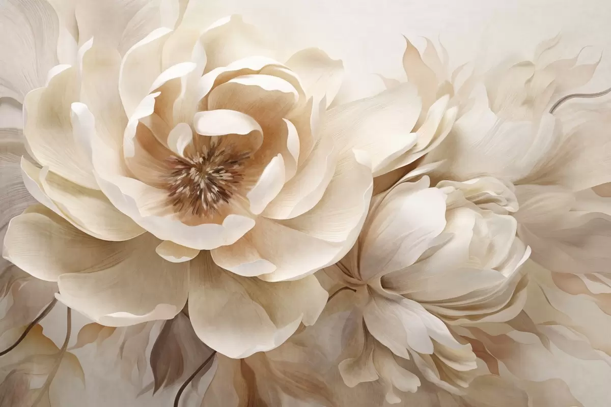 Fototapetes Krēmveida tekstūras peonijas ar brūnu centru un lapām uz izplūduša gaiša abstrakta fona Nr. w09554