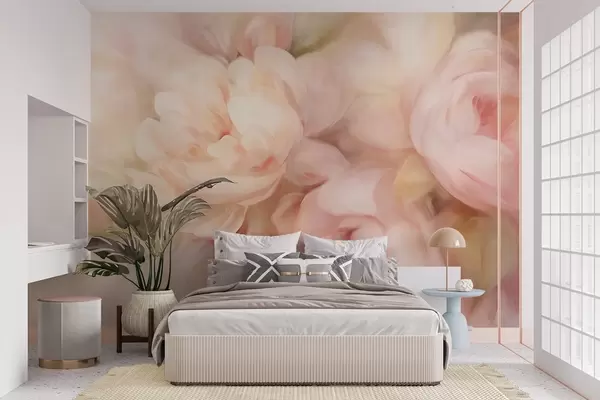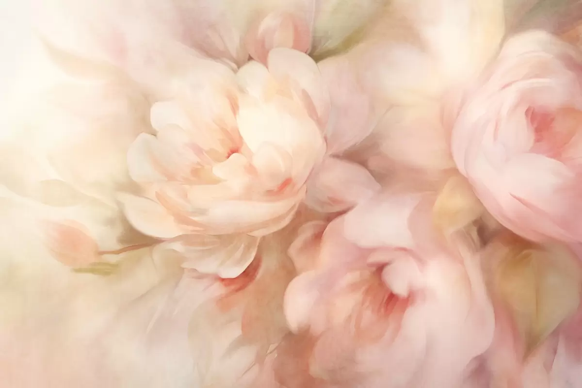 Fototapetes Izplūdušas gaiši rozā un krēmkrāsas peonijas ar maigām, gleznieciskām otu triepienu imitācijām, radot teksturētu ziedu kompozīciju. Nr. w09556