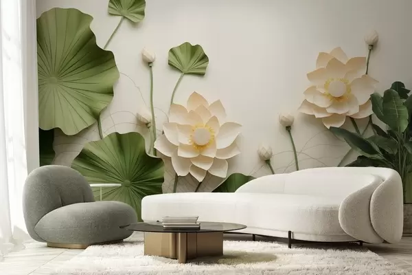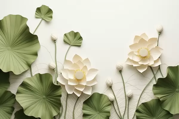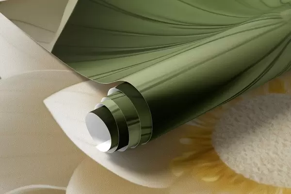 Fototapetes 3D lotosa ziedi ar zaļām teksturētām lapām, minimālisma stilā Nr. w09560