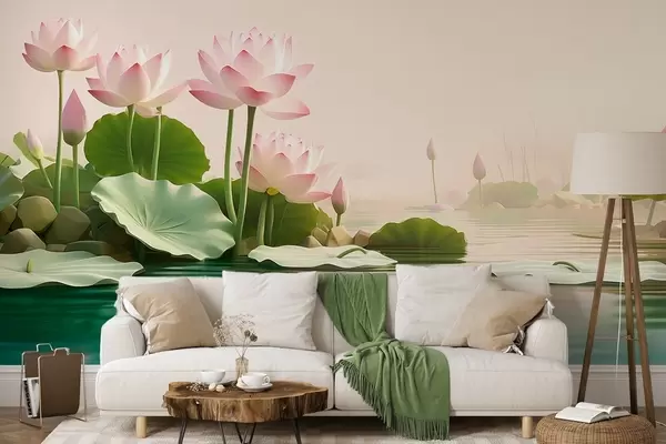 Fototapetes Rozā lotosa ziedi uz ūdens, mierīgs tropu ainava Nr. w09561
