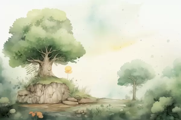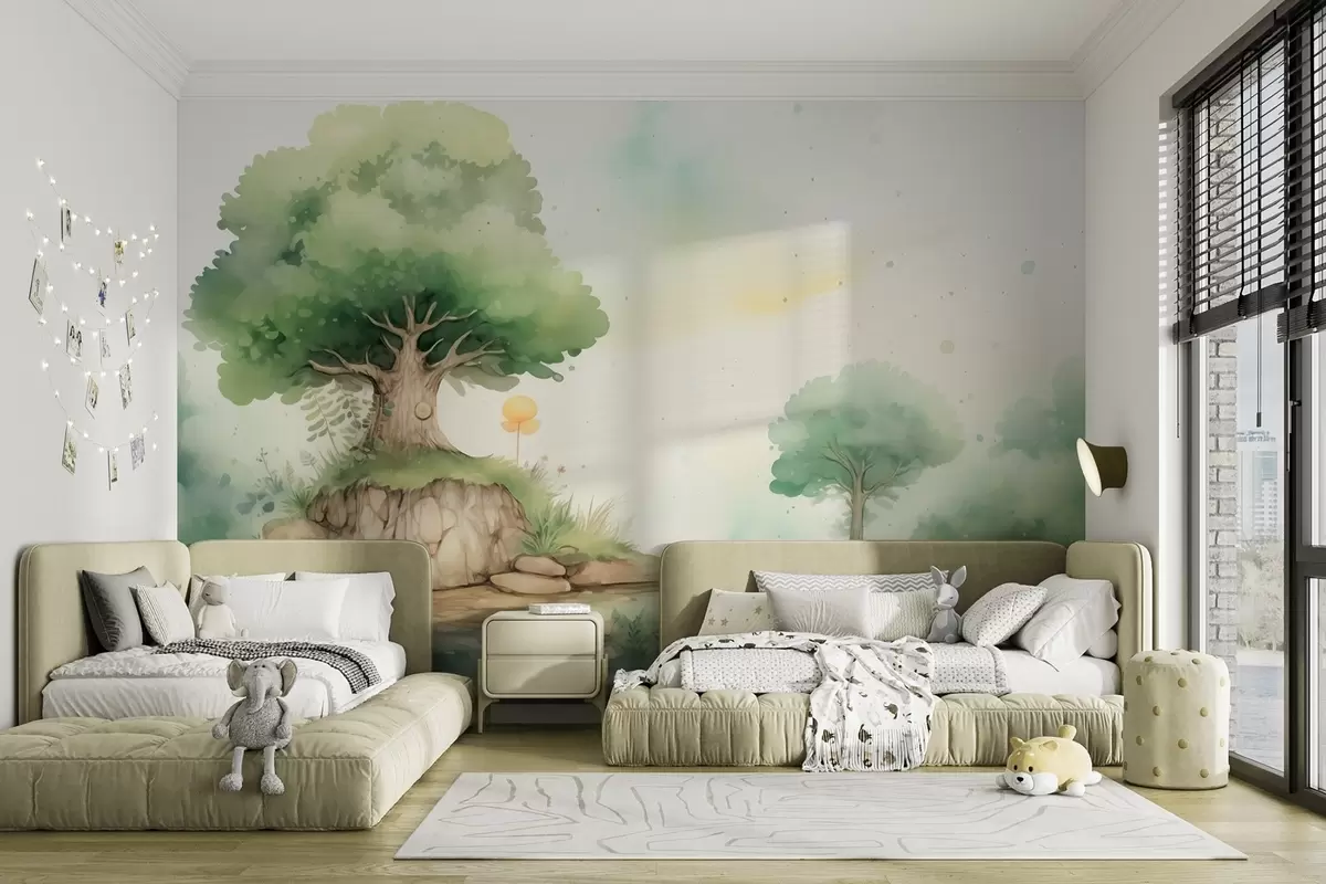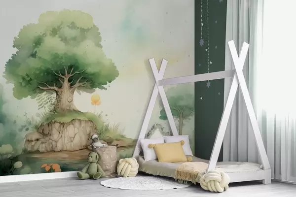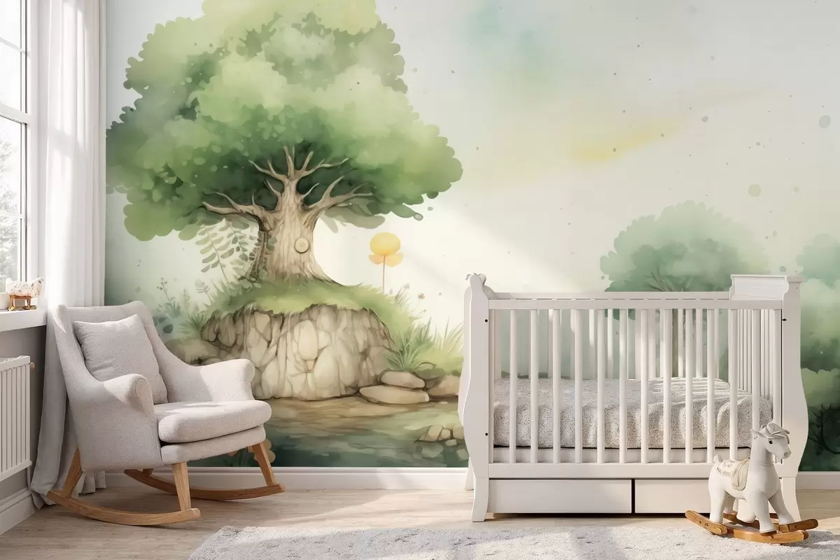 Fototapetes Pasaku pasaule bērnībā zaļā meža ainavā, akvareļu stilā Nr. w09566