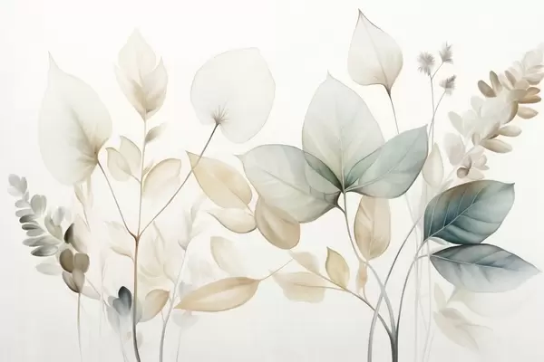Fototapetes Teksturētas caurspīdīgas lapas klusinātos smilškrāsas un zilas krāsas toņos, ar smalkām kātiņām uz maiga, gaiša fona Nr. w09583