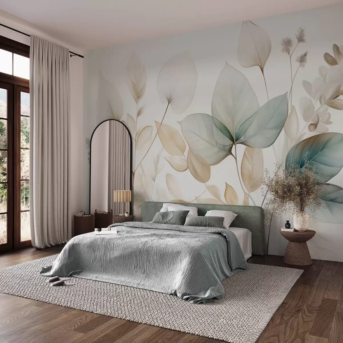 Fototapetes Teksturētas caurspīdīgas lapas klusinātos smilškrāsas un zilas krāsas toņos, ar smalkām kātiņām uz maiga, gaiša fona Nr. w09583