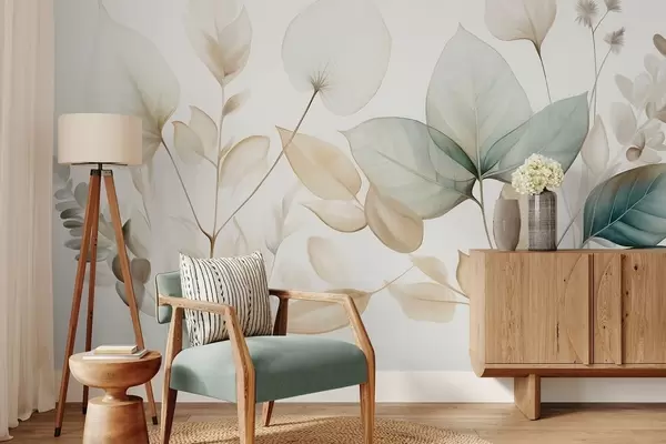 Fototapetes Teksturētas caurspīdīgas lapas klusinātos smilškrāsas un zilas krāsas toņos, ar smalkām kātiņām uz maiga, gaiša fona Nr. w09583