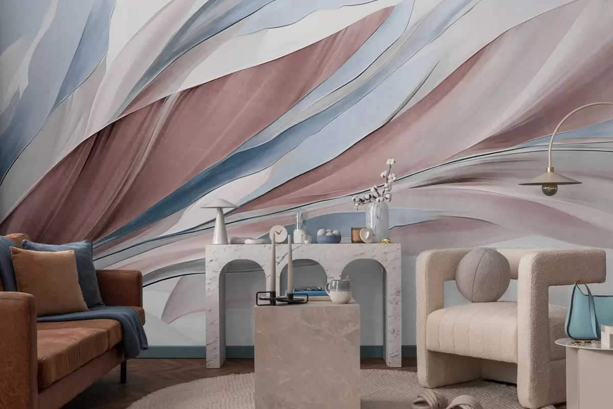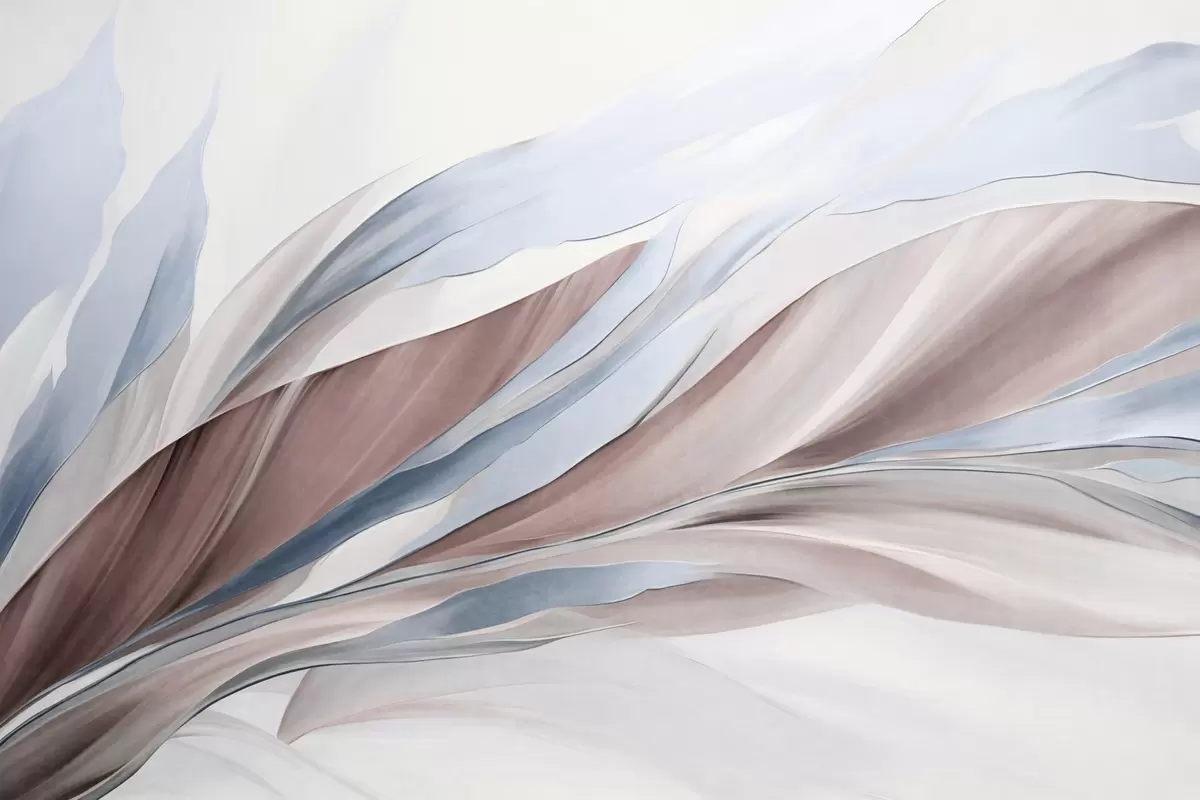 Fototapetes Abstraktas plūstošas zilas un brūnas viļņi ar plānām formām un līnijām uz balta fona, teksturēta māksla Nr. w09585v1