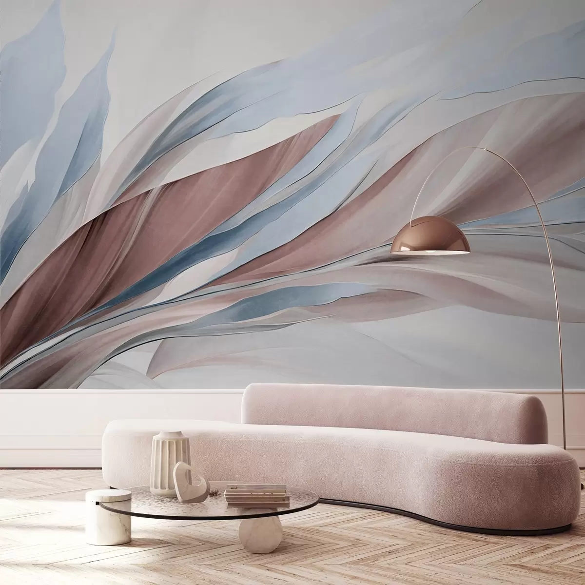 Fototapetes Abstraktas plūstošas zilas un brūnas viļņi ar plānām formām un līnijām uz balta fona, teksturēta māksla Nr. w09585v1