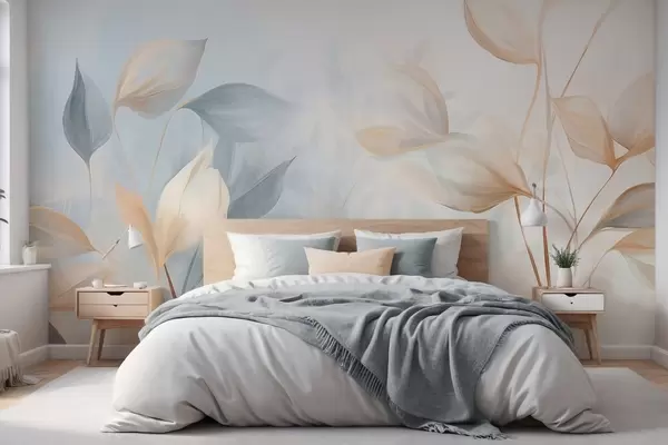 Fototapetes Mīksti, delikāti, caurspīdīgi lapas klusinātos toņos – smilškrāsā, persiku un gaiši zilā krāsā, teksturēti pasteļtoņos. Nr. w09607