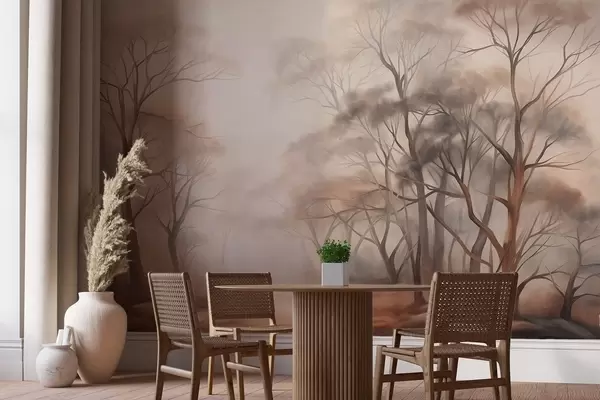 Fototapetes Teksturēti koki miglā apklātā mežā, miglains ainava ar klusām, nomierinošām krāsām un maigu apgaismojumu Nr. w09609