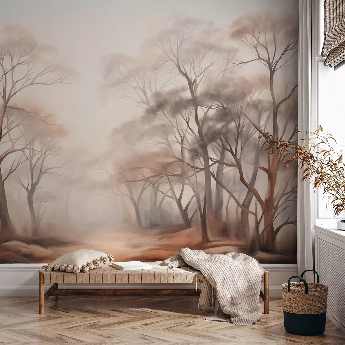 Fototapetes Teksturēti koki miglā apklātā mežā, miglains ainava ar klusām, nomierinošām krāsām un maigu apgaismojumu Nr. w09609