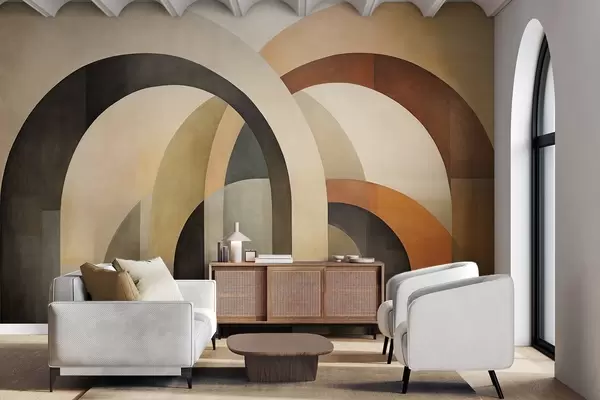 Fototapetes Abstraktas teksturētas ģeometriskas arkas zemes toņos – smilškrāsā, brūnā un pelēkā, daudzslāņains moderns arhitektūras dizains. Nr. w09611