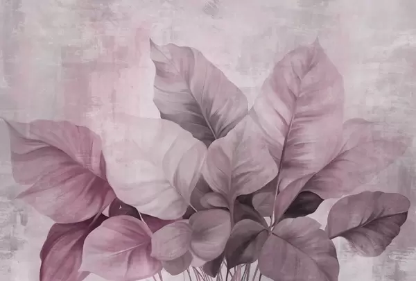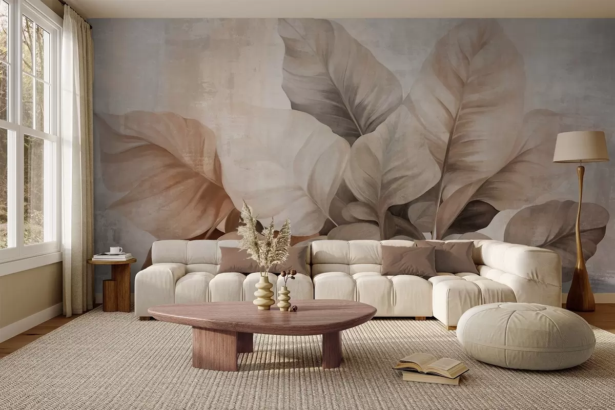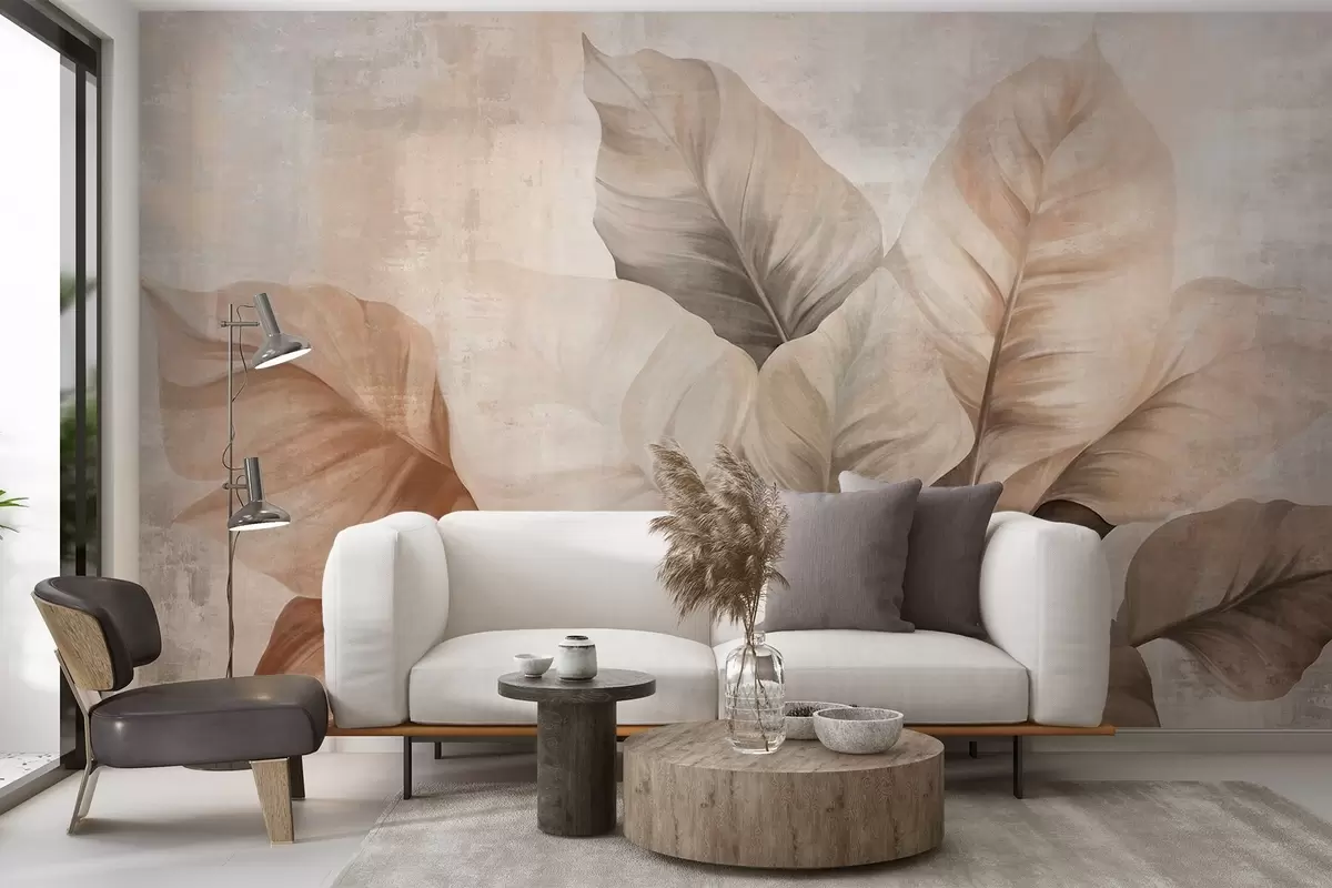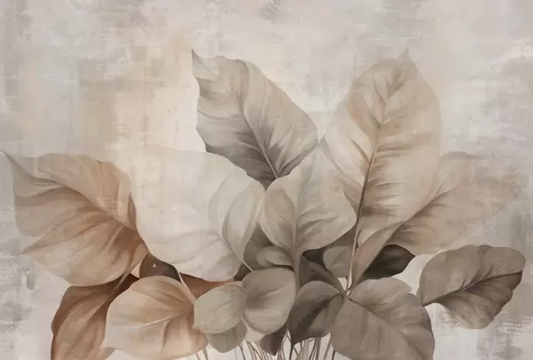Fototapetes Teksturēta glezna, kas imitē lielas, gaiši brūnas lapas uz neitrāla fona ar smalkām otu triepieniem. Nr. w09614