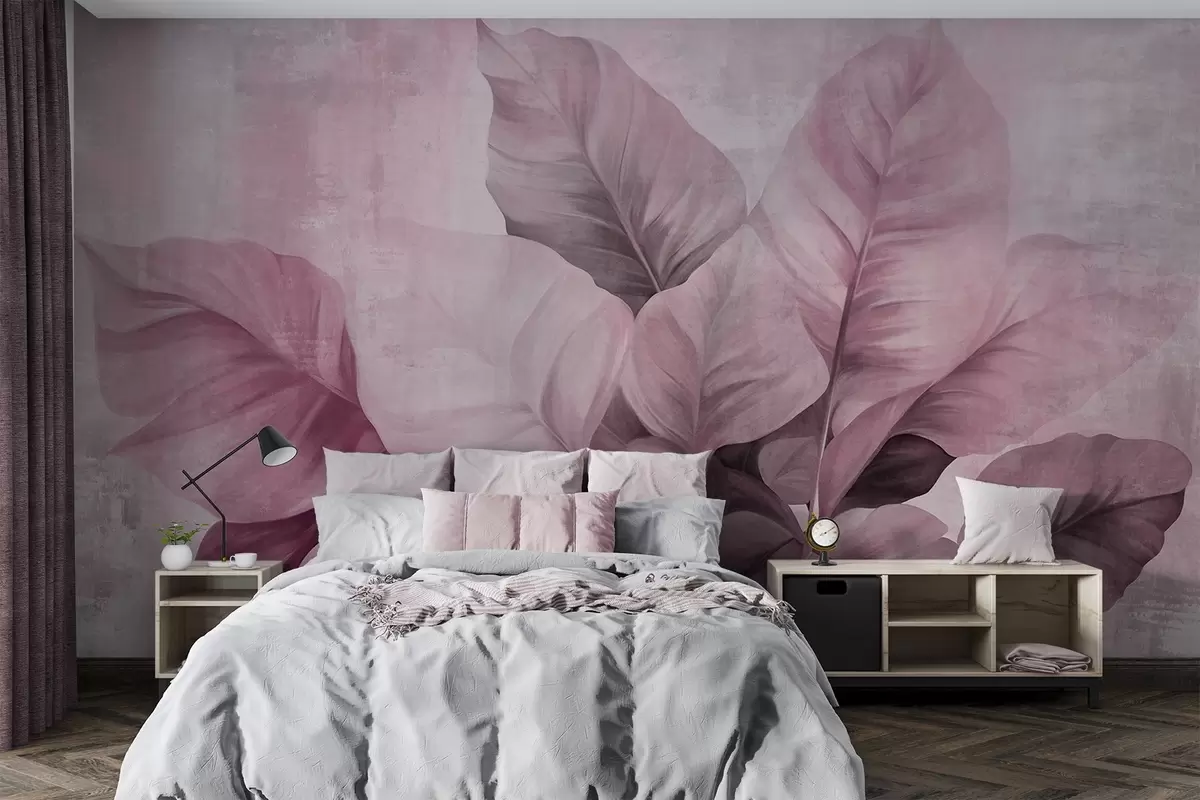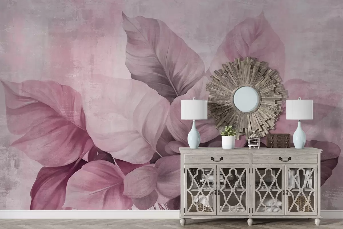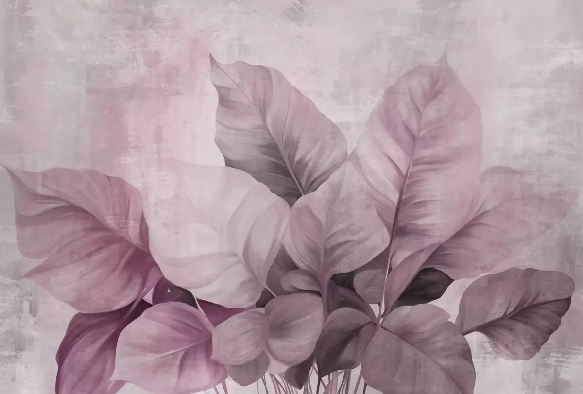Fototapetes Teksturēta glezna, kas imitē lielas, gaiši rozā lapas uz neitrāla fona ar smalkām otu triepieniem. Nr. w09614v1