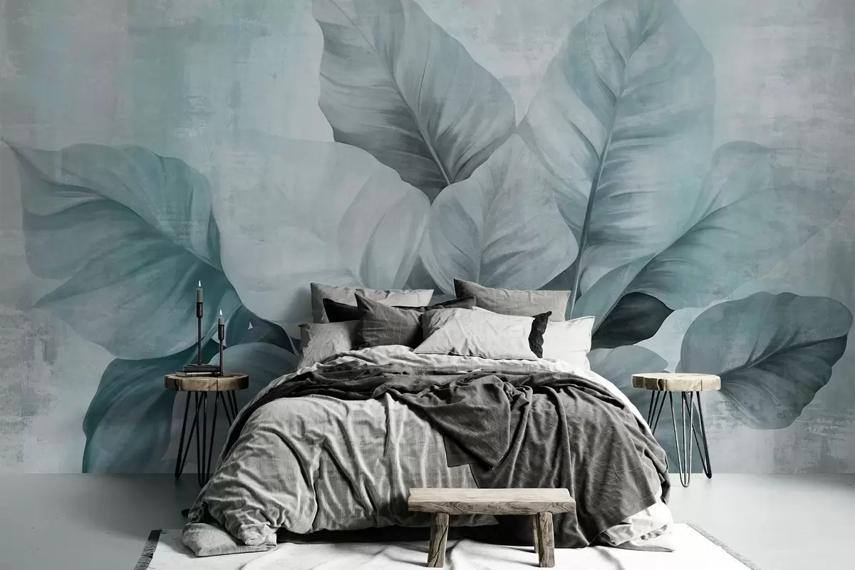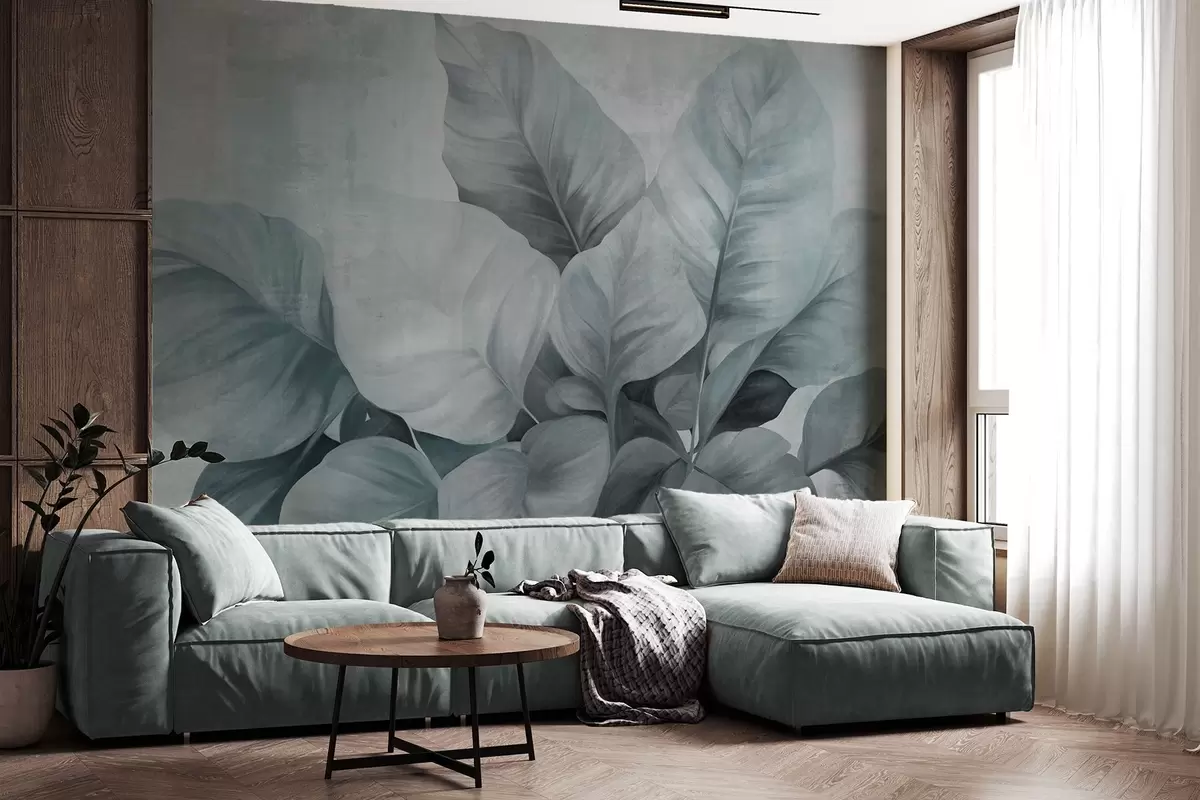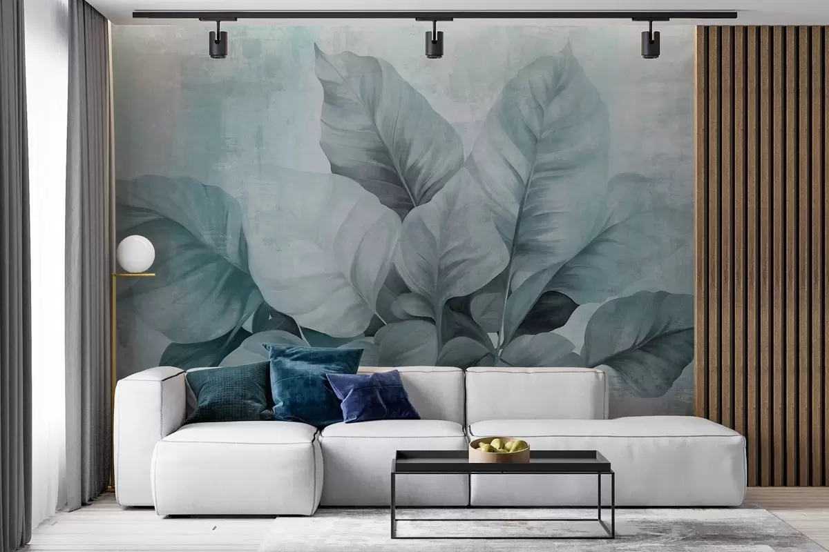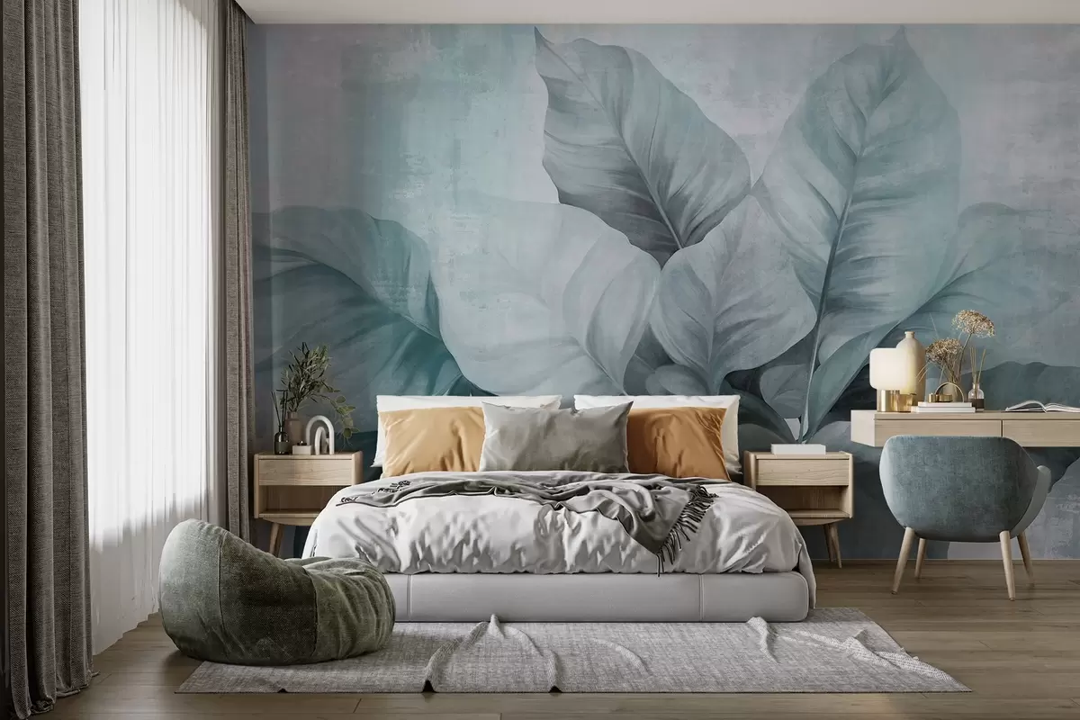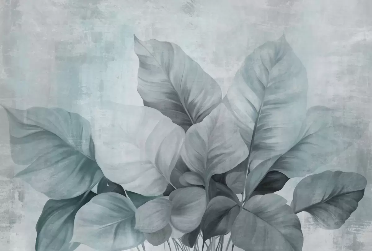 Fototapetes Teksturēta glezna, kas imitē lielas, gaiši zilas lapas uz neitrāla fona ar smalkām otām Nr. w09614v2