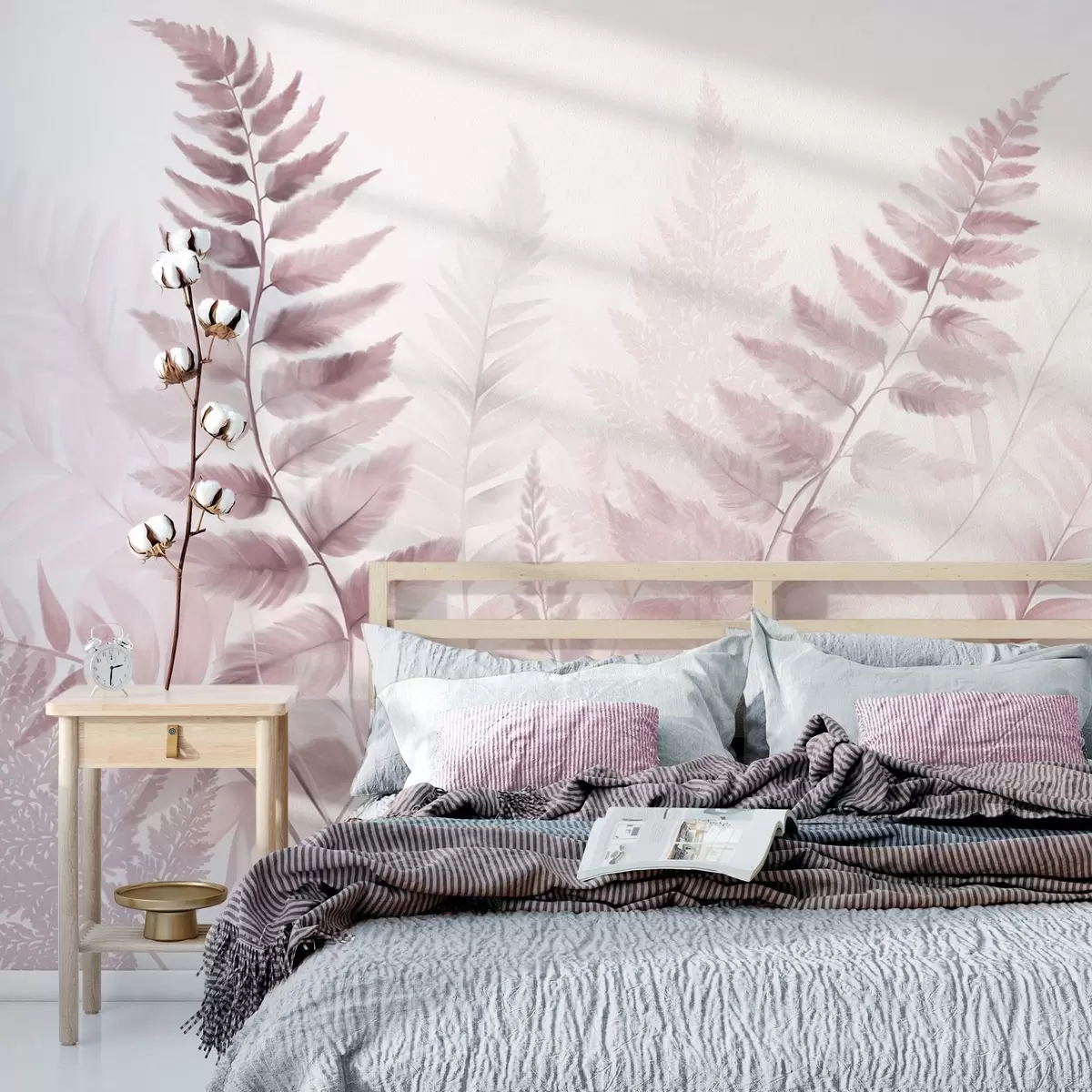 Fototapetes Teksturēti žāvēti papardes lapas dažādos rozā toņos, ar maigu, gaišu fonu akvareļa stilā Nr. w09615v2