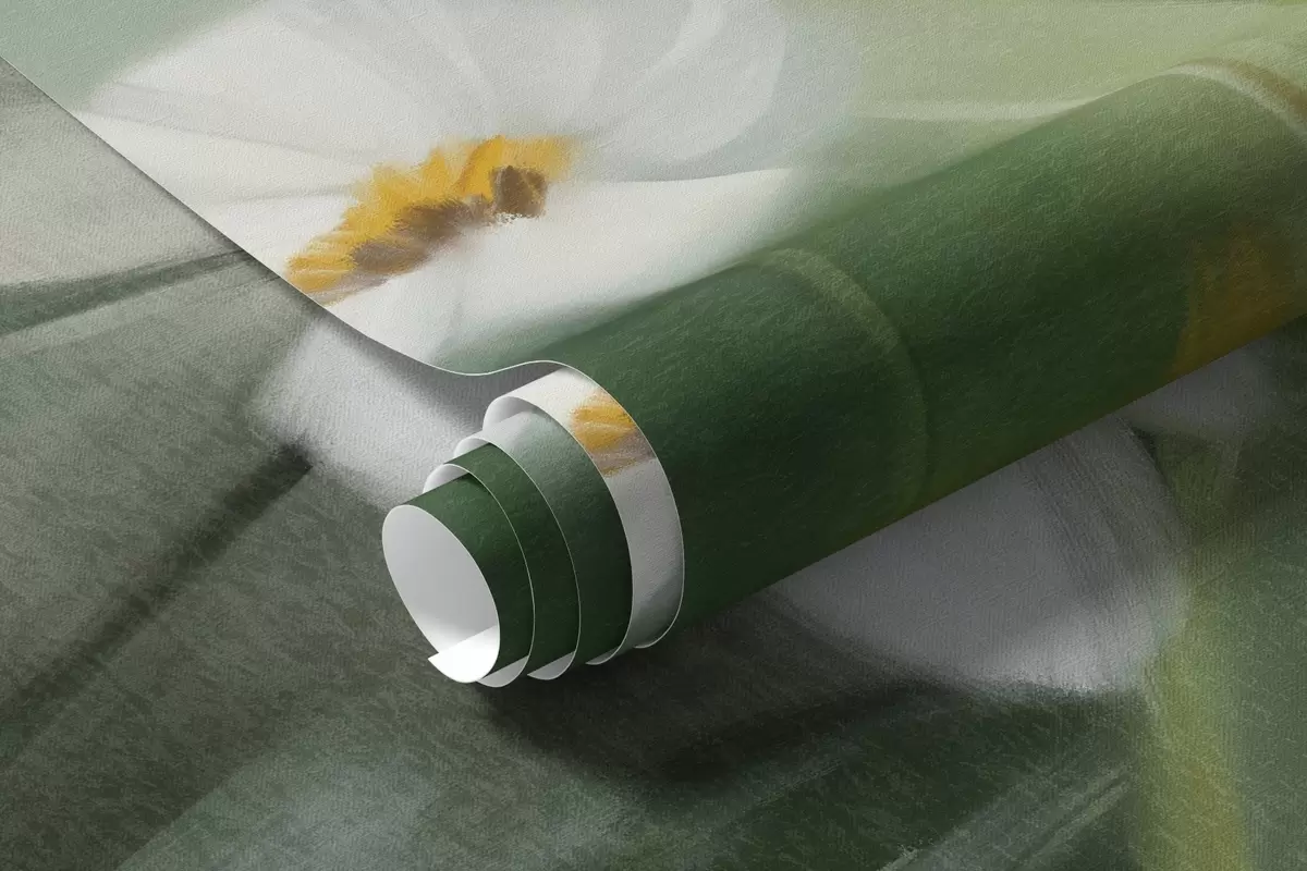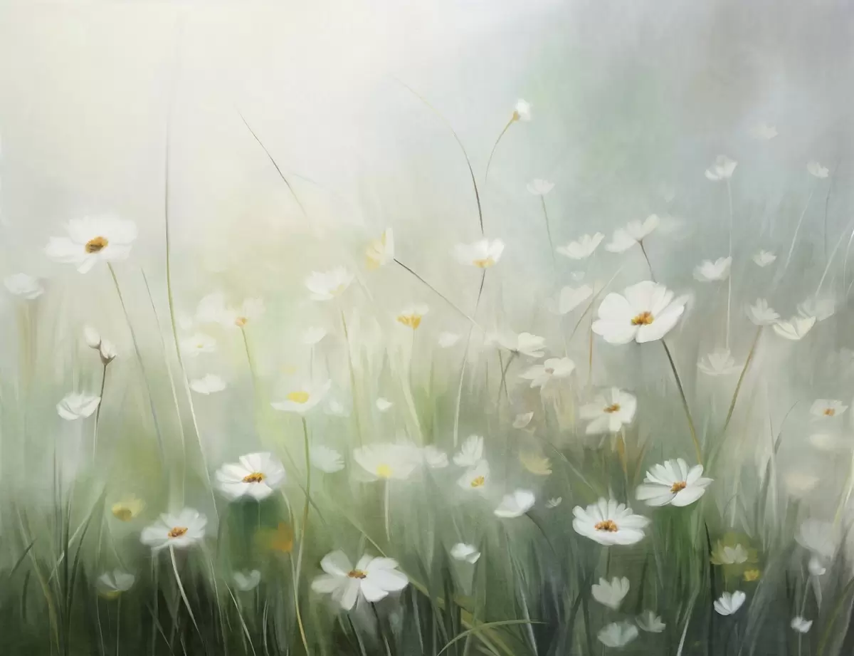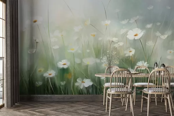 Fototapetes Abstrakts lauks ar baltām margarītēm, zaļu zāli un maigu, miglainu fonu glezniecības stilā Nr. w09619