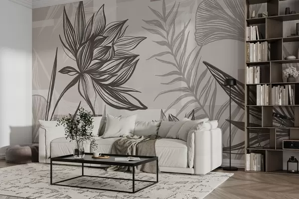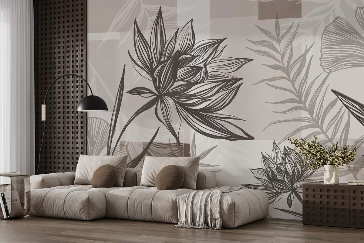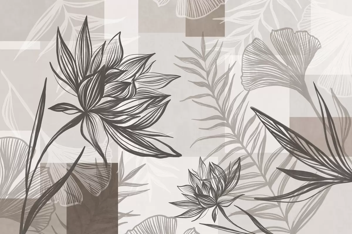 Fototapetes Teksturēti stilizēti ziedi un lapas brūnos un smilškrāsas toņos, ar ģeometrisku fonu, līniju zīmējums Nr. w09629