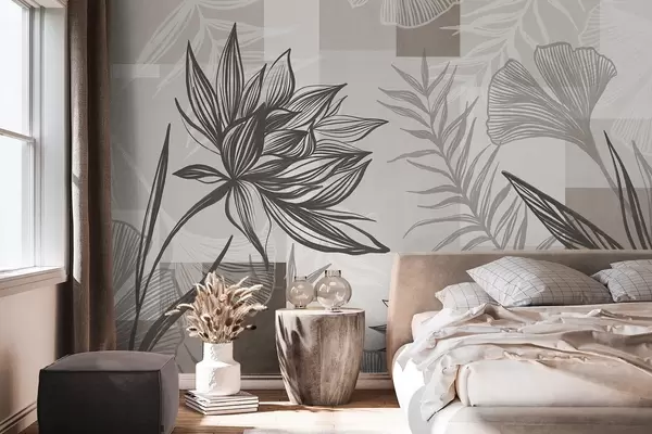 Fototapetes Teksturēti stilizēti ziedi un lapas brūnos un smilškrāsas toņos, ar ģeometrisku fonu, līniju zīmējums Nr. w09629