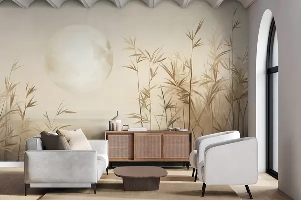 Fototapetes Teksturēts ainavas ar augstiem niedriem, ezeru un bālu mēnesi miglā apklātā debesīs Nr. w09631